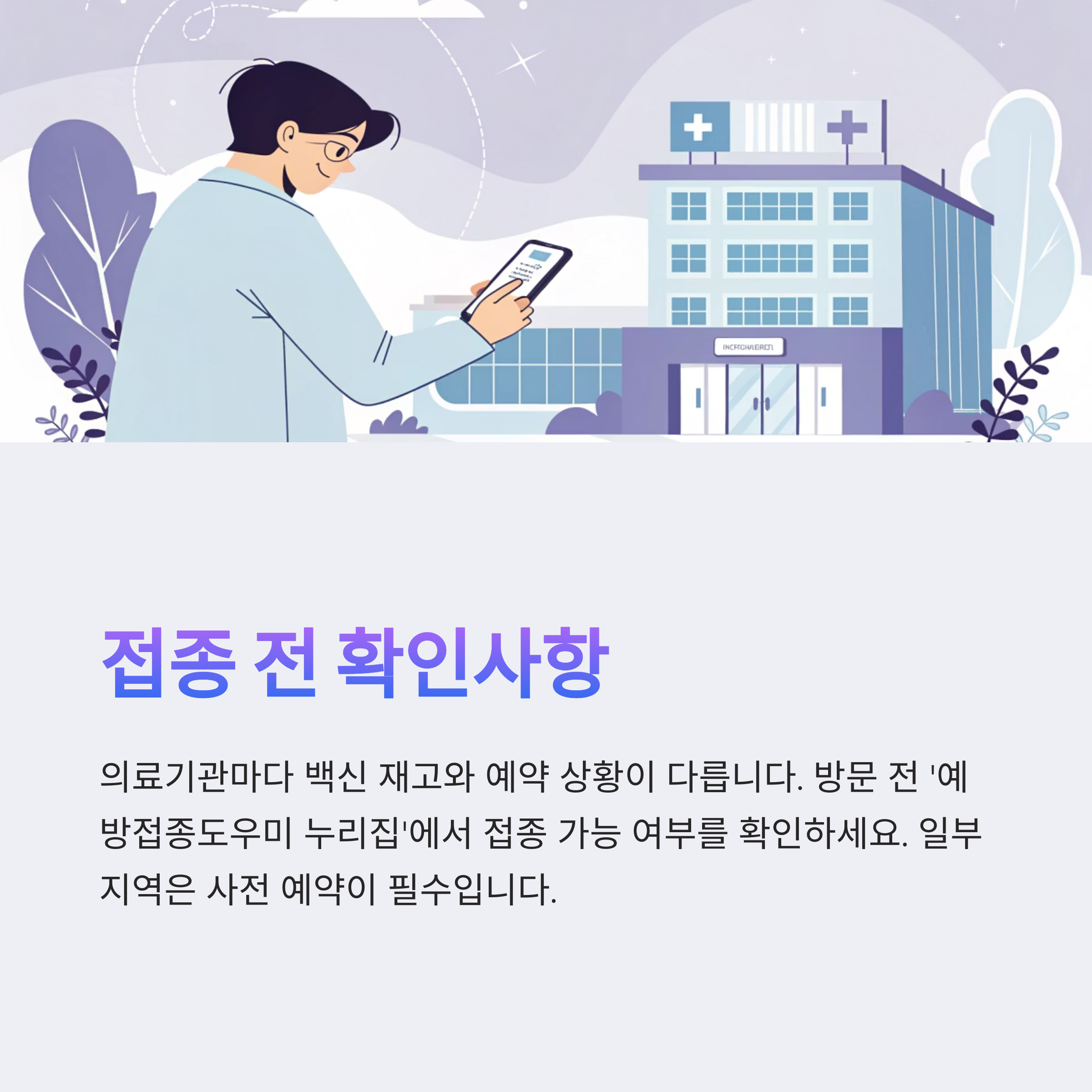 전국 위탁의료기관이나 보건소에서 접종이 가능하지만, 기관마다 백신 보유량과 예약 상황이 다를 수 있습니다. 방문 전 ‘예방접종도우미 누리집’에서 접종 가능 여부를 사전에 확인하는 것이 좋습니다. 일부 지역에서는 사전 예약이 필수이므로 정확한 정보 확인이 중요합니다.