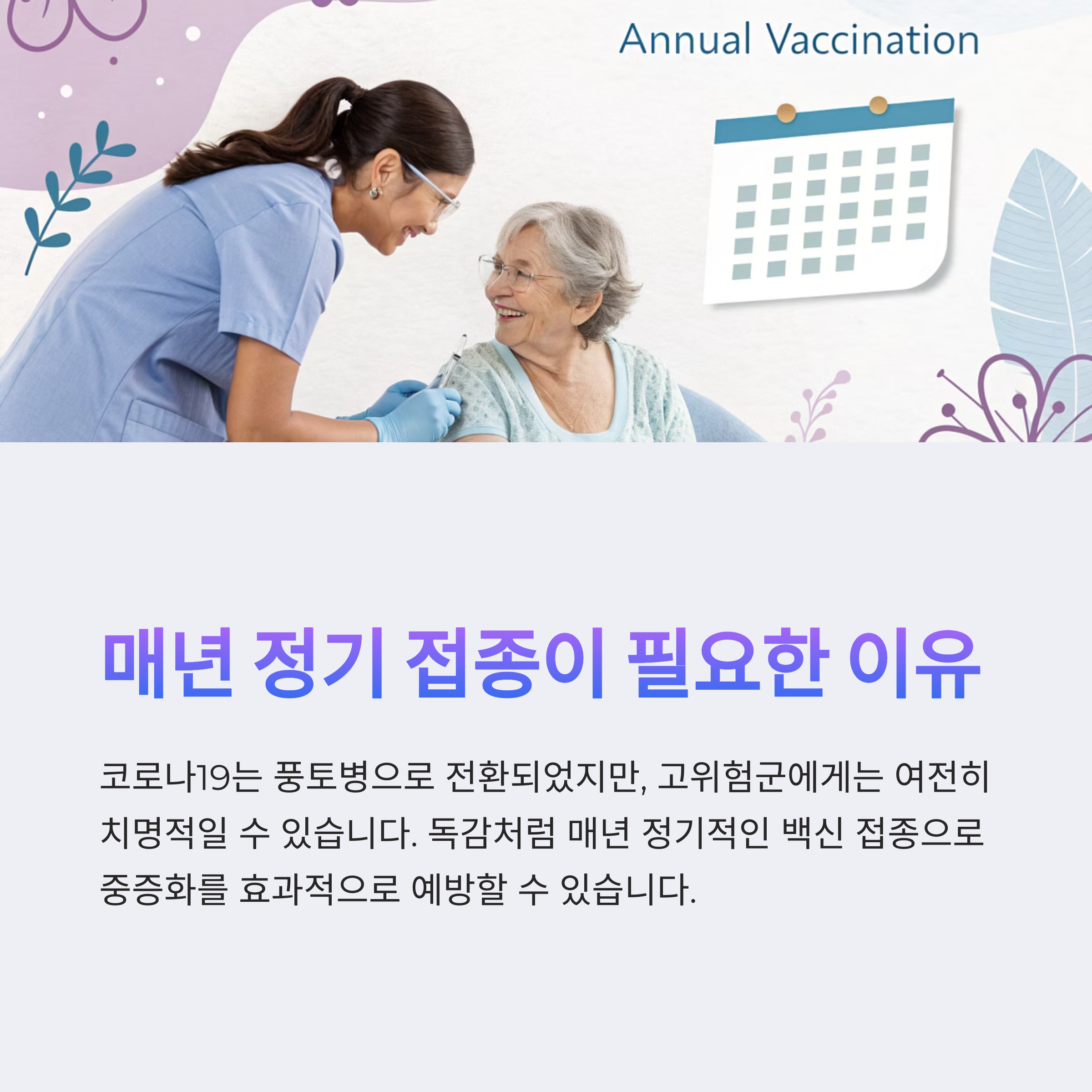 코로나19는 이제 풍토병으로 전환되었지만, 고위험군에서는 여전히 치명적인 결과를 초래할 수 있습니다. 따라서 독감처럼 매년 정기적인 백신 접종이 필요합니다. 특히 면역 기능이 떨어지는 고령층과 면역저하자는 백신을 통해 중증화를 예방할 수 있는 가장 효과적인 방법을 갖게 되는 셈입니다.
