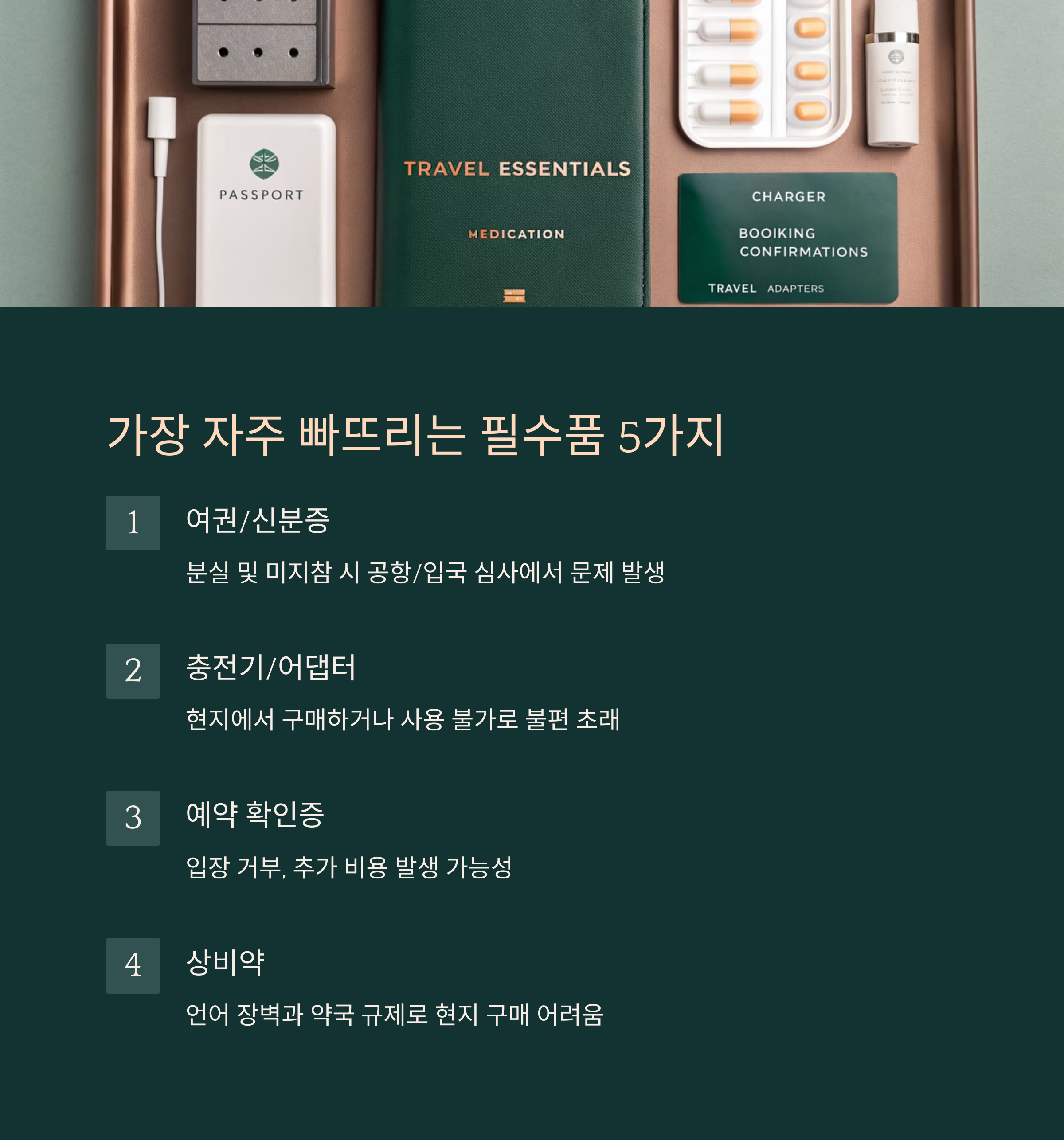 이처럼 여행 필수품을 제대로 챙기지 않으면, 단순한 실수 하나가 일정 전체에 혼란을 주며 동행자 모두에게 불편을 끼칠 수 있습니다.