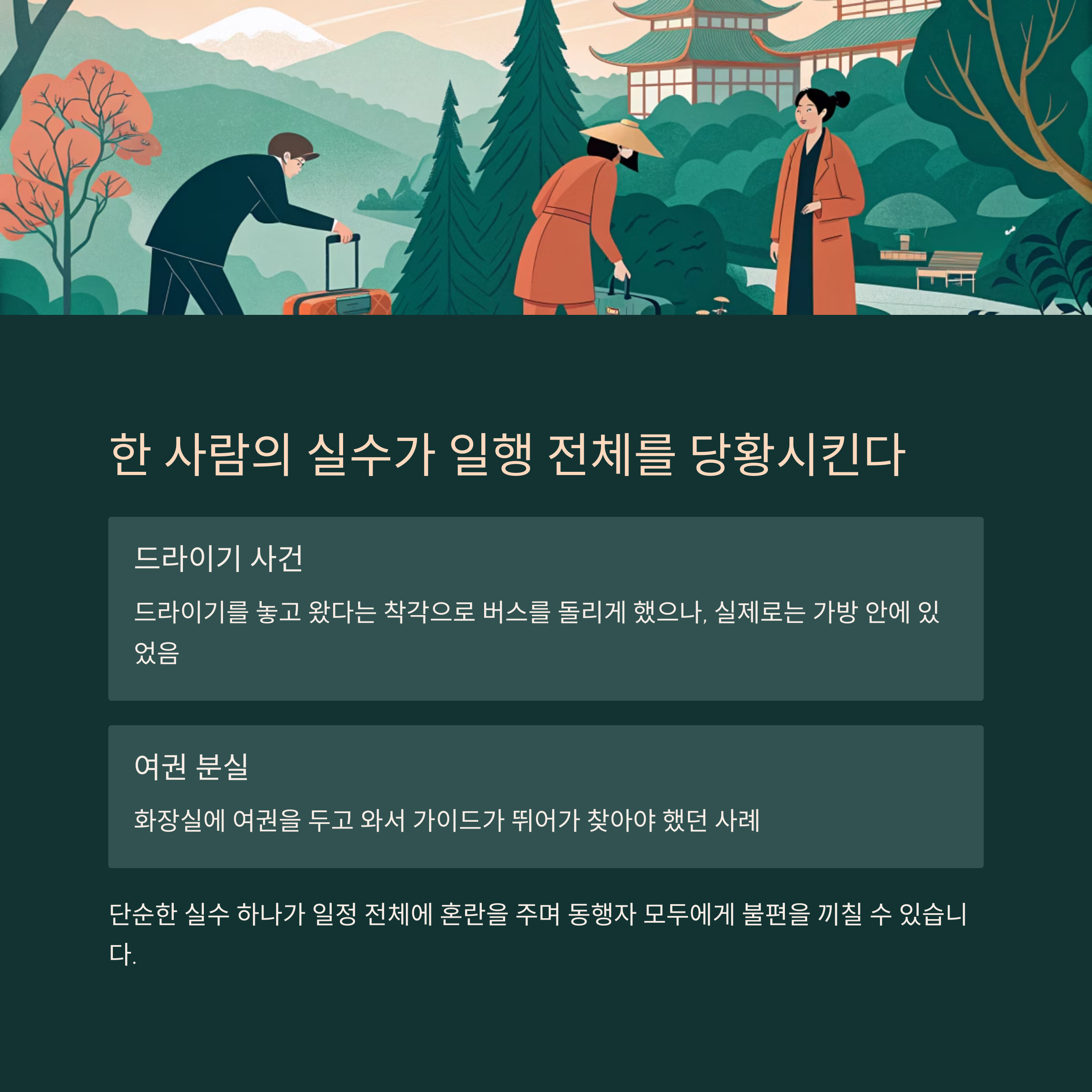 한 여행객은 드라이기를 놓고 왔다는 착각으로 버스를 돌리게 했고, 실제로는 가방 안에 있던 물건이었습니다. 또 다른 사례에서는 여권을 화장실에 두고 와서 가이드가 뛰어가 찾는 일이 발생했습니다.