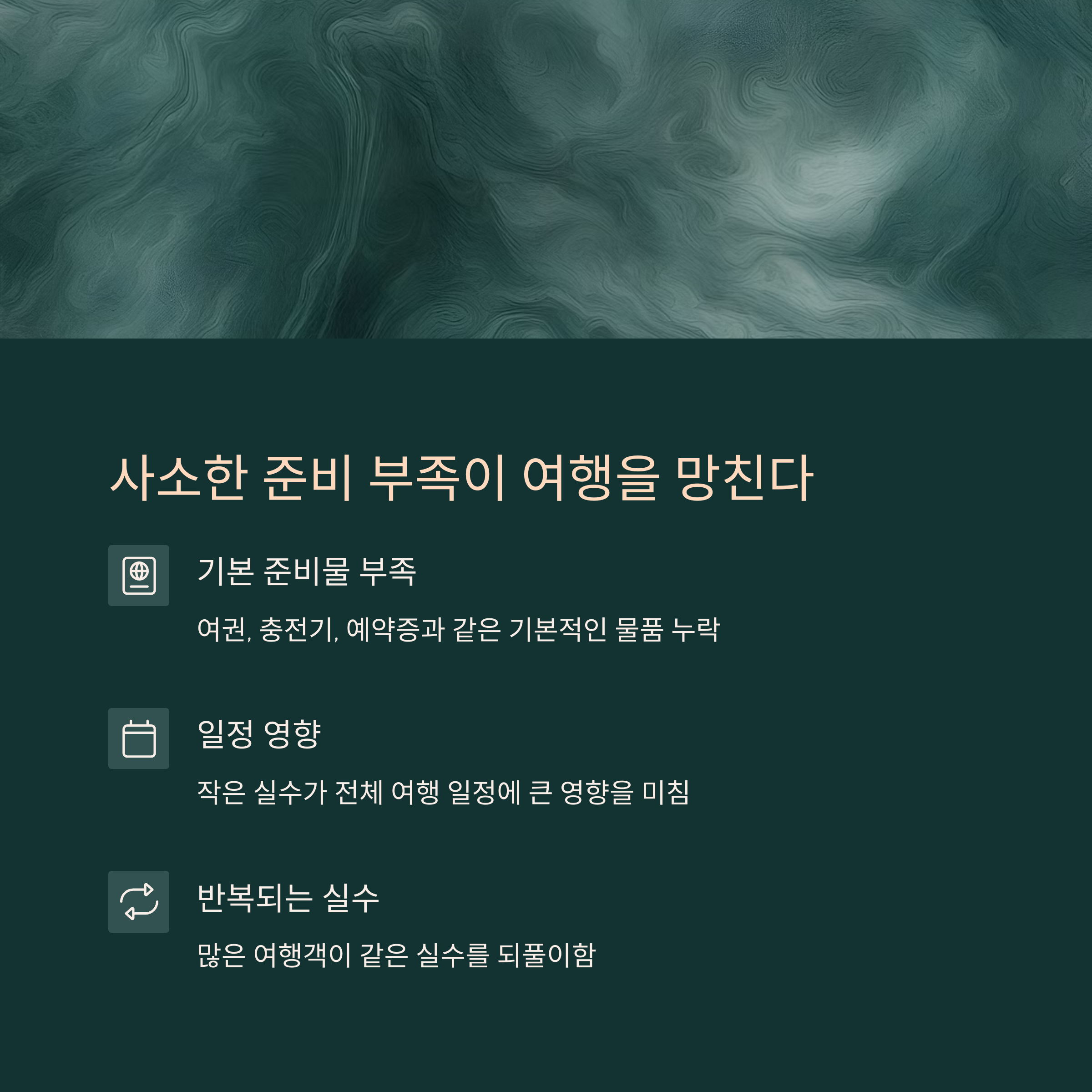 이처럼 여행 필수품을 제대로 챙기지 않으면, 단순한 실수 하나가 일정 전체에 혼란을 주며 동행자 모두에게 불편을 끼칠 수 있습니다.