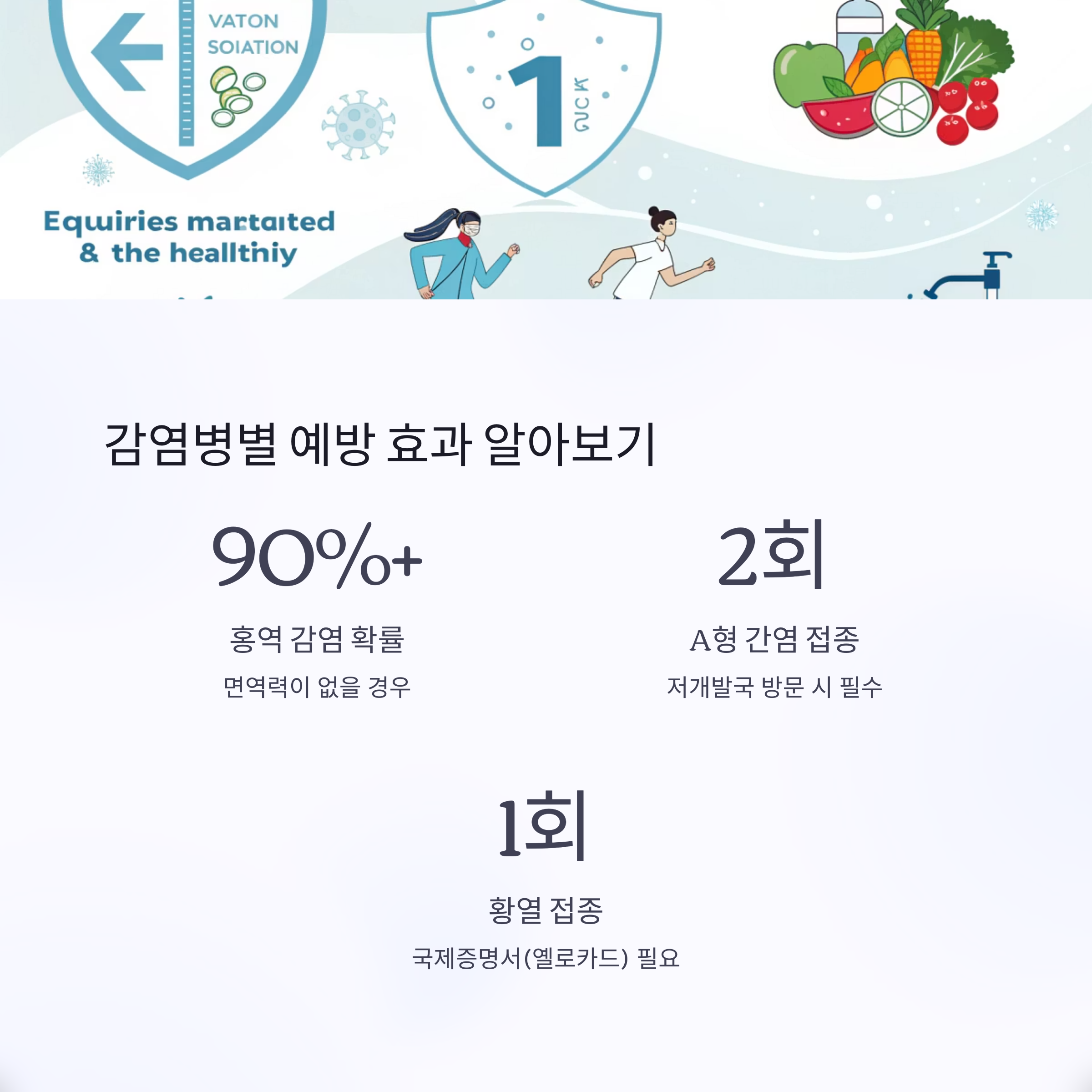 | A형 간염 | 출국 4주 전 2회 접종 (1회도 효과 있음) |