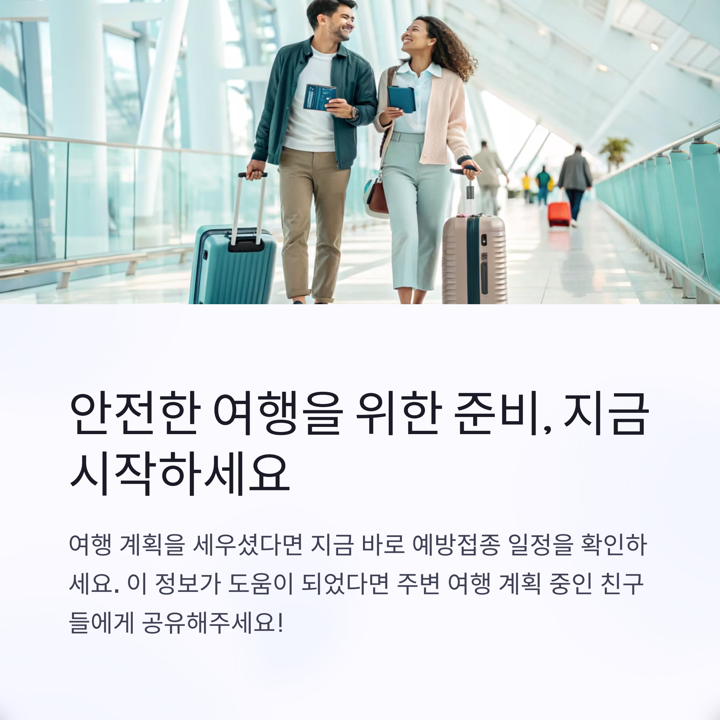 | 황열 | 출국 10일 전 1회 접종 + 옐로카드 필요 |
