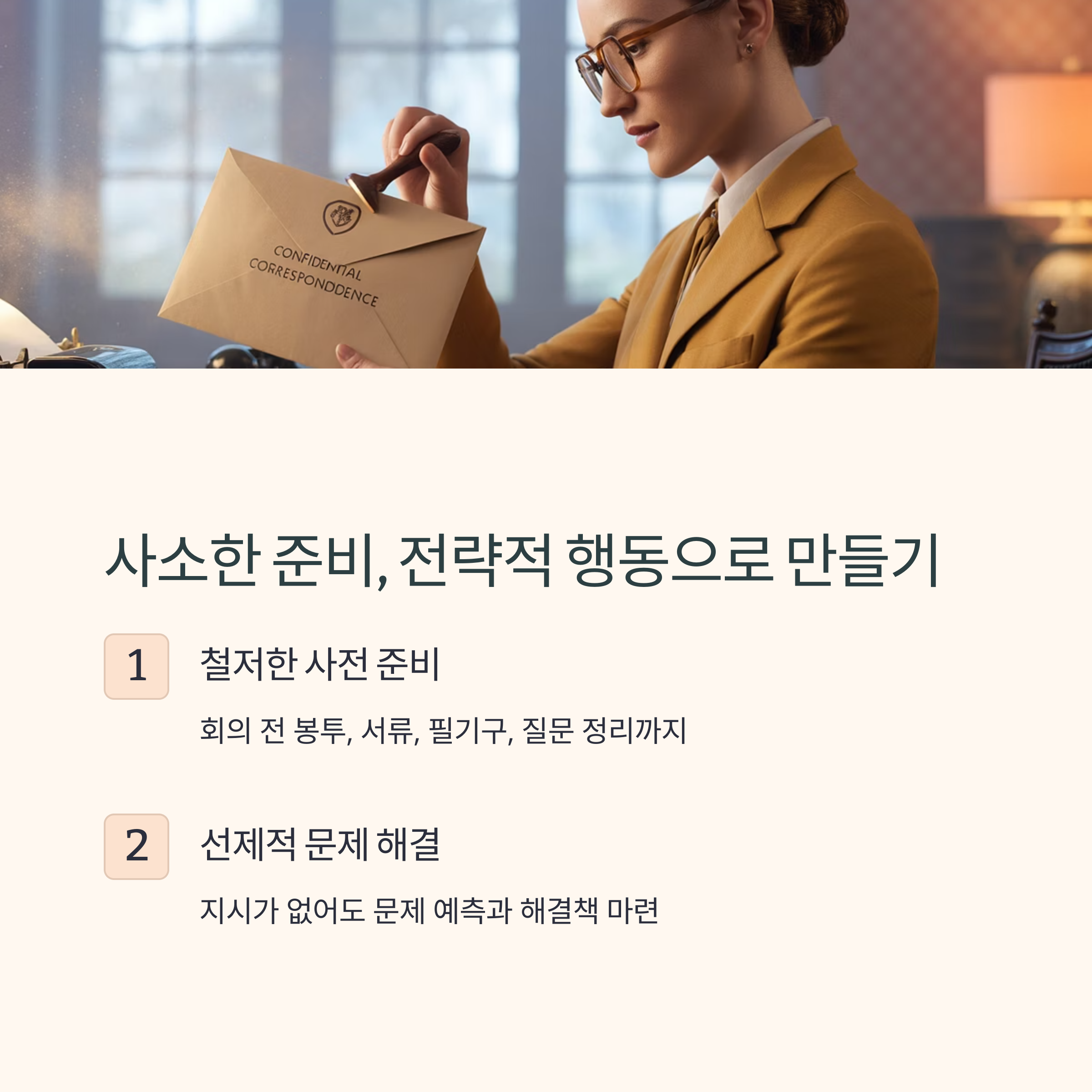 - 회의 전 봉투, 서류, 필기구, 질문 정리까지 사전 준비