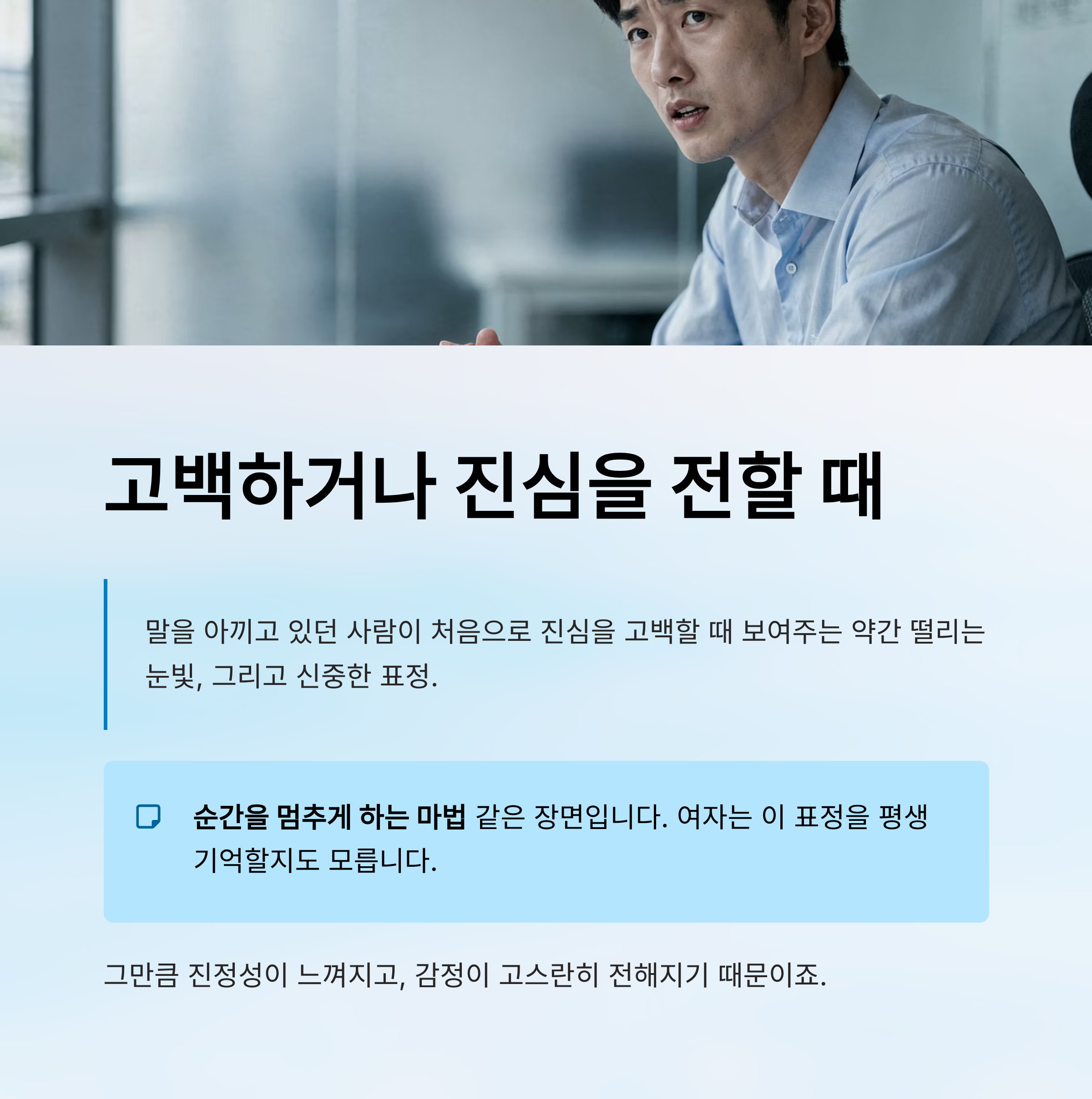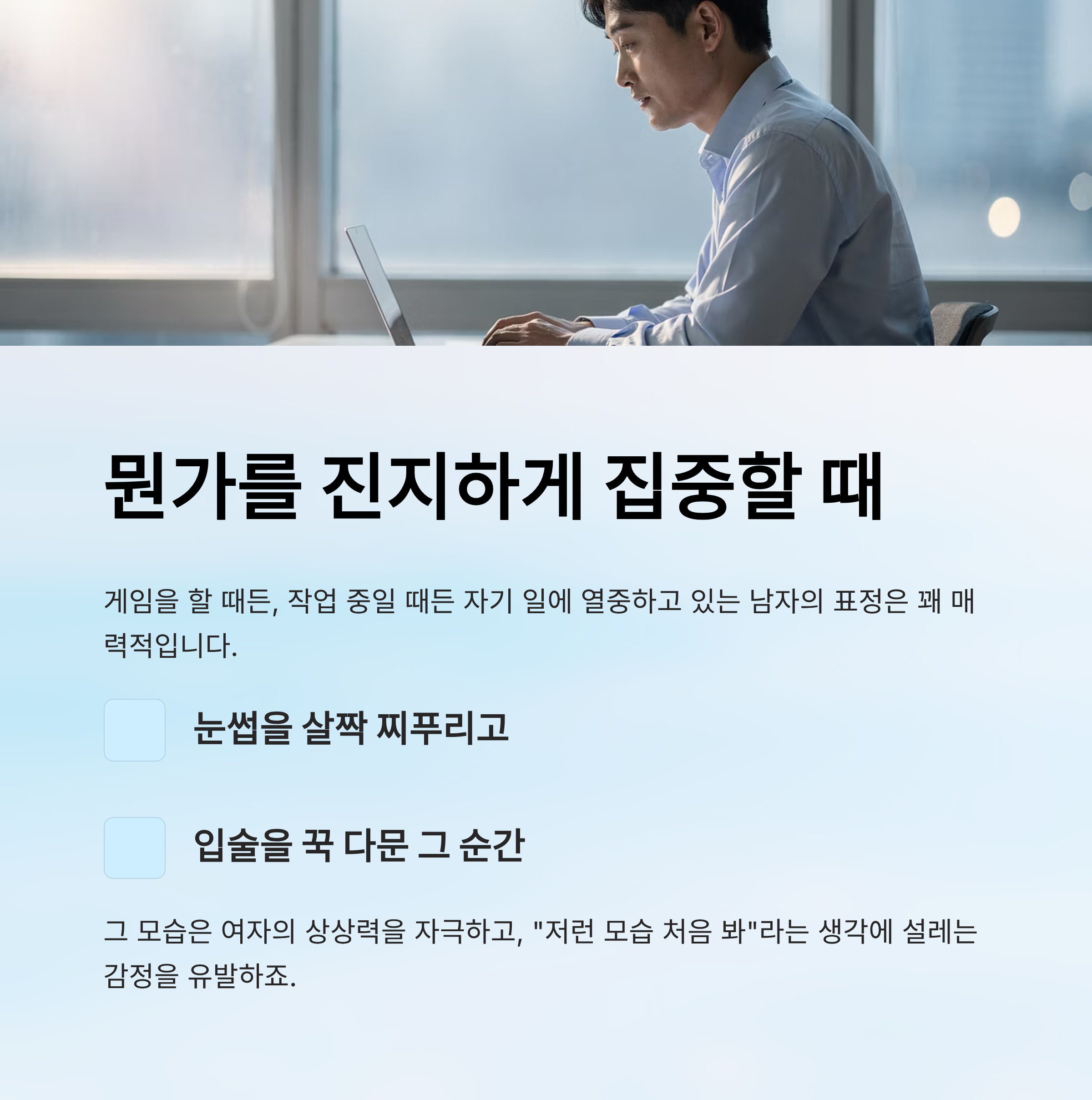 특히 진지한 대화 중 갑자기 깊어진 눈빛은 여자의 마음을 단번에 흔들 수 있습니다.
