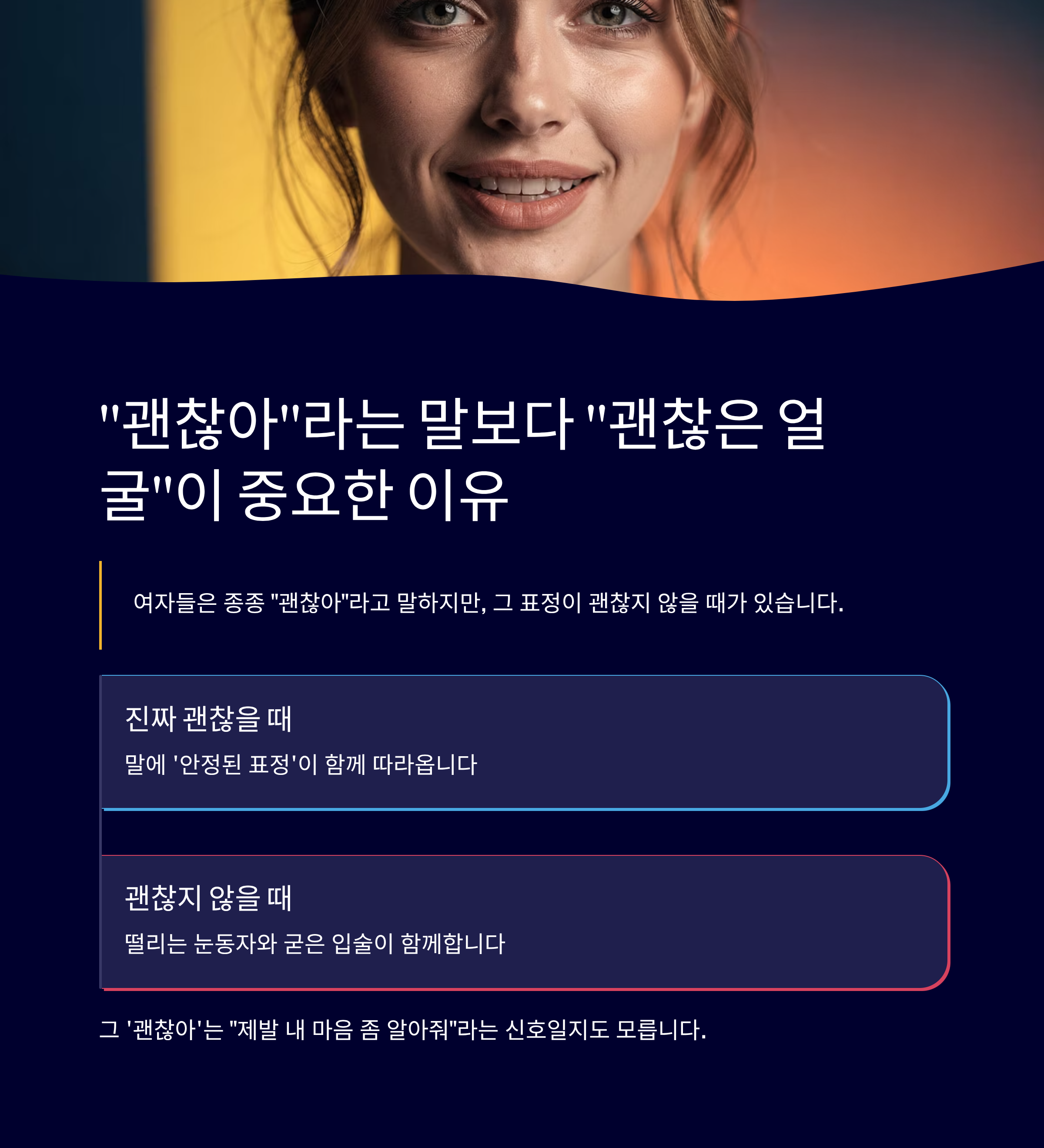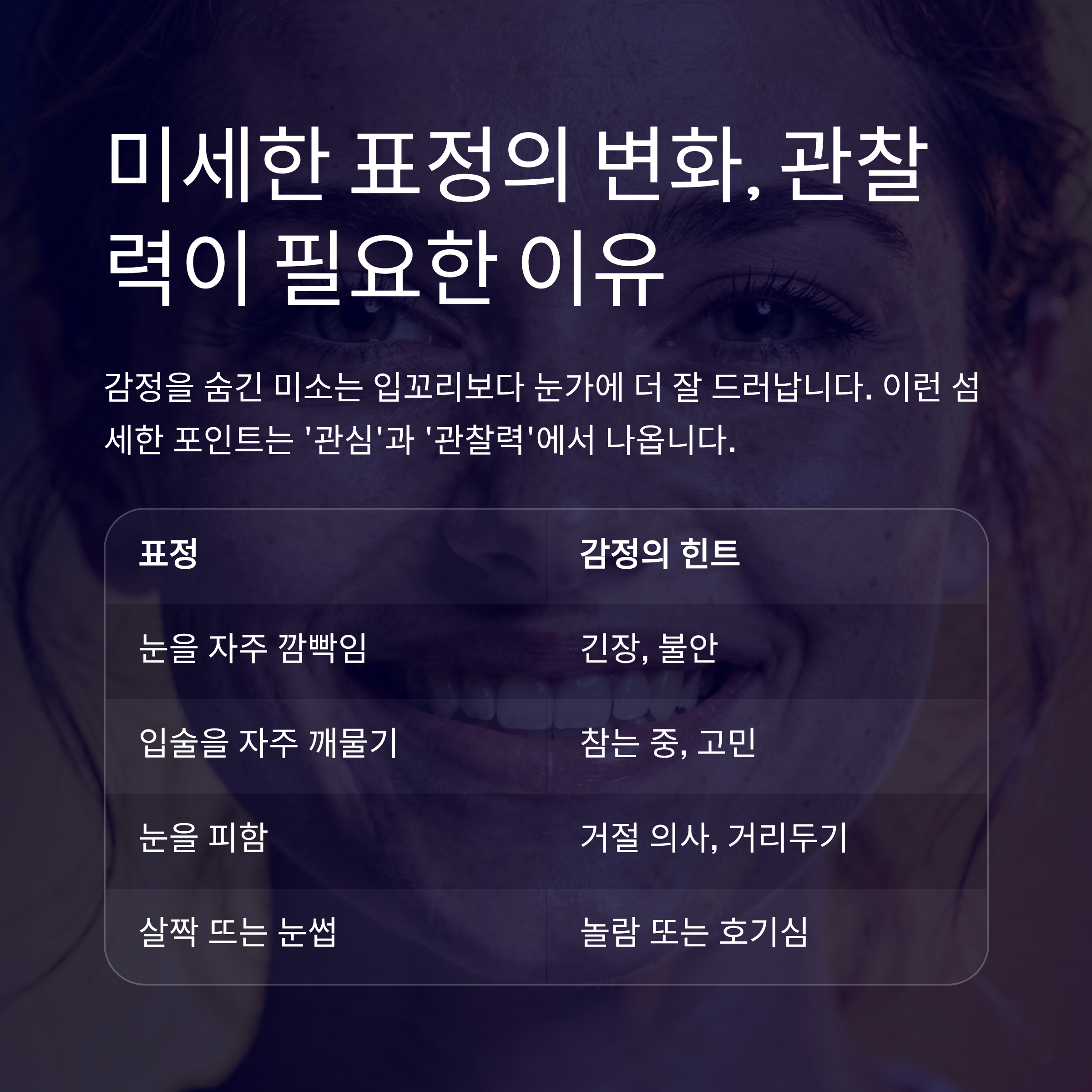 특히 여성은 감정 표현이 더 섬세하고 미묘하기 때문에, 표정이 더욱 중요한 힌트가 됩니다.
