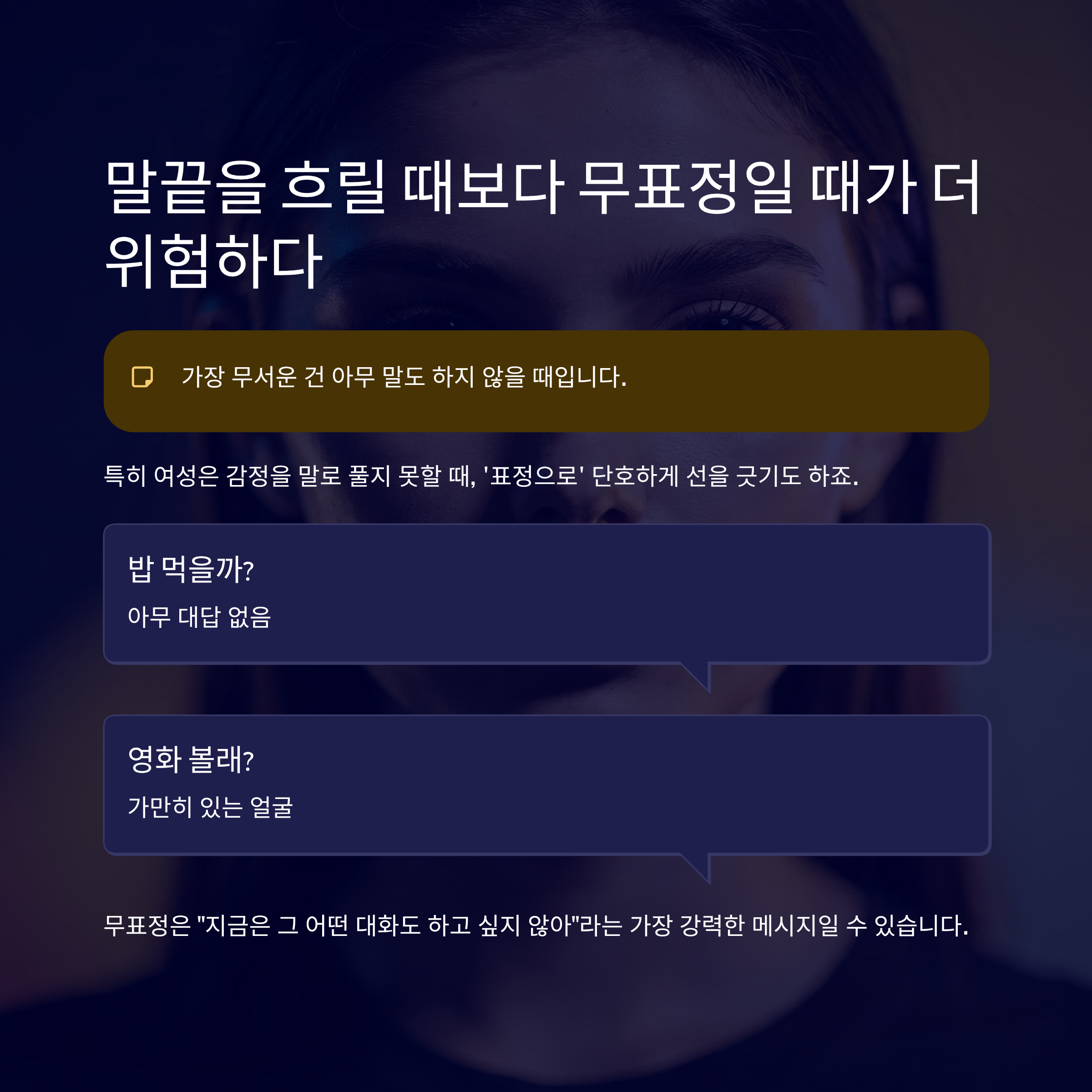 특히 여성은 감정을 말로 풀지 못할 때, ‘표정으로’ 단호하게 선을 긋기도 하죠.