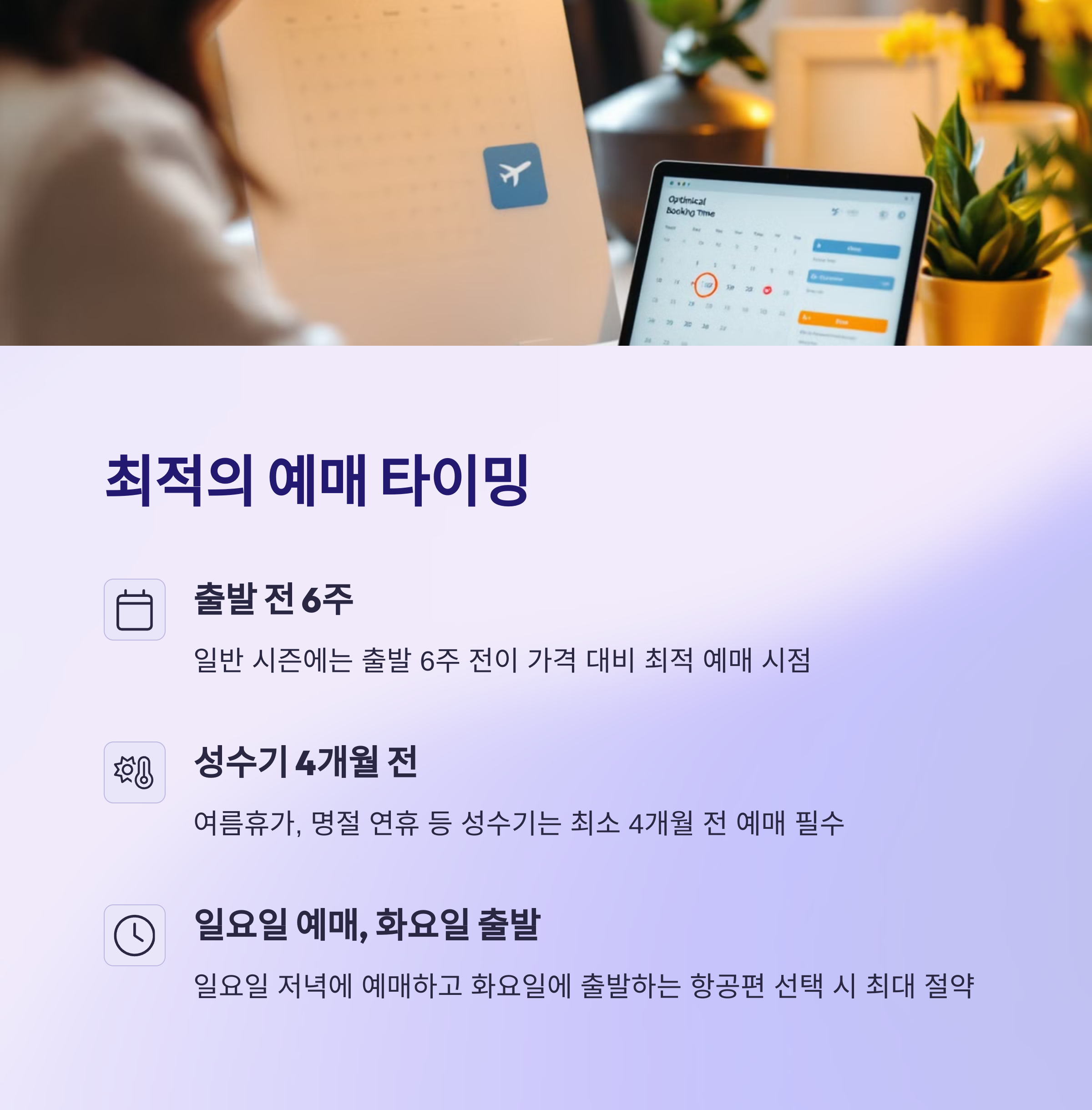 | 출국 6주 전, 성수기는 4개월 전 예매 추천 | 일요일 예약, 화요일 출발이 가장 경제적 | 공동구매, 땡처리 항공권 적극 활용 |