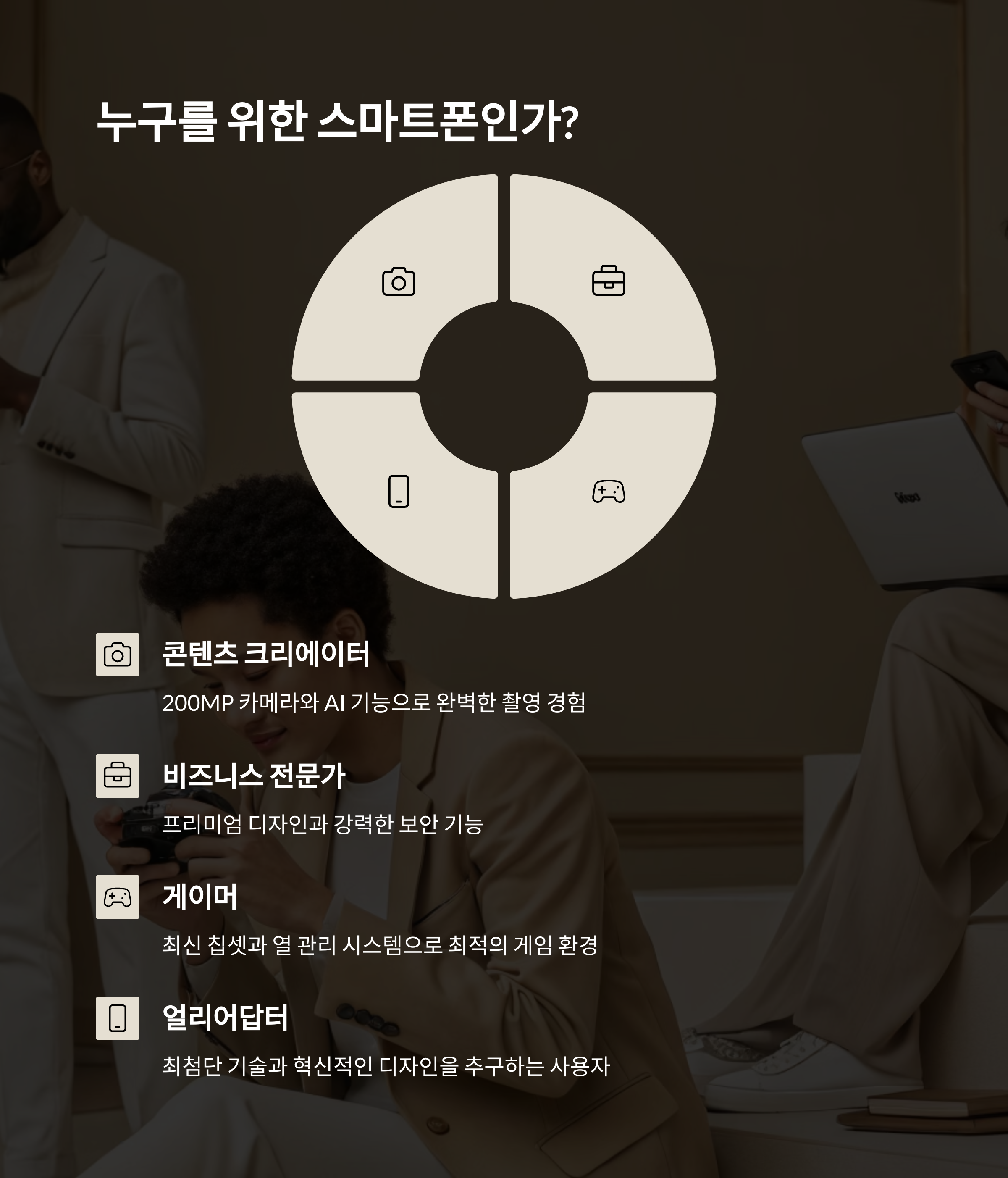 고성능, AI 기능, 프리미엄 디자인, 안전성, 촬영 품질 등