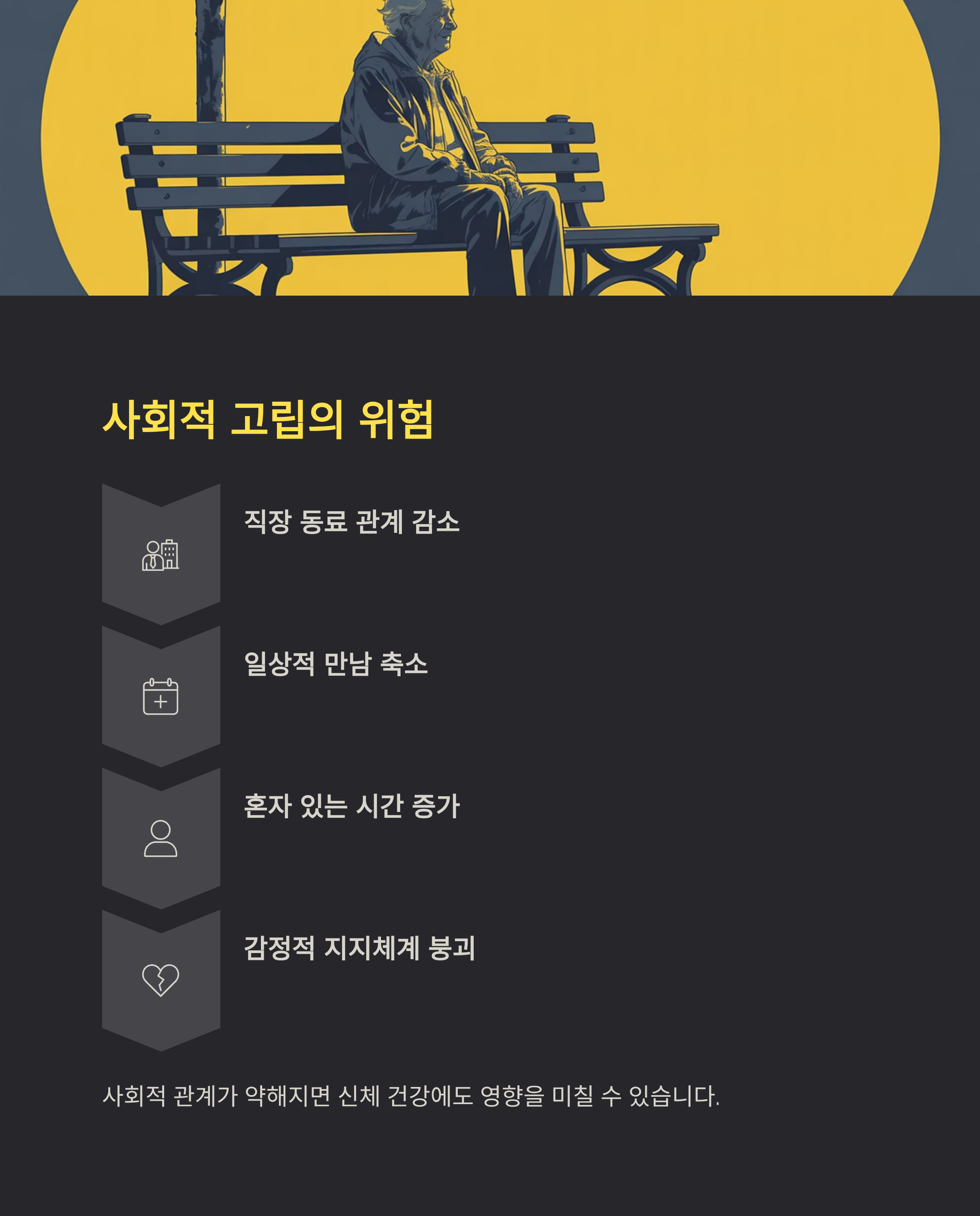 은퇴 후 가장 큰 위험은 ‘사회적 고립’입니다. 직장 동료들과의 관계는 자연스럽게 줄어들고, 일상적인 만남이 줄어들면서 혼자 있는 시간이 점점 길어집니다. 사회적 관계가 약해지면 감정적 지지체계도 붕괴되고, 이는 신체 건강에도 영향을 미칠 수 있습니다.