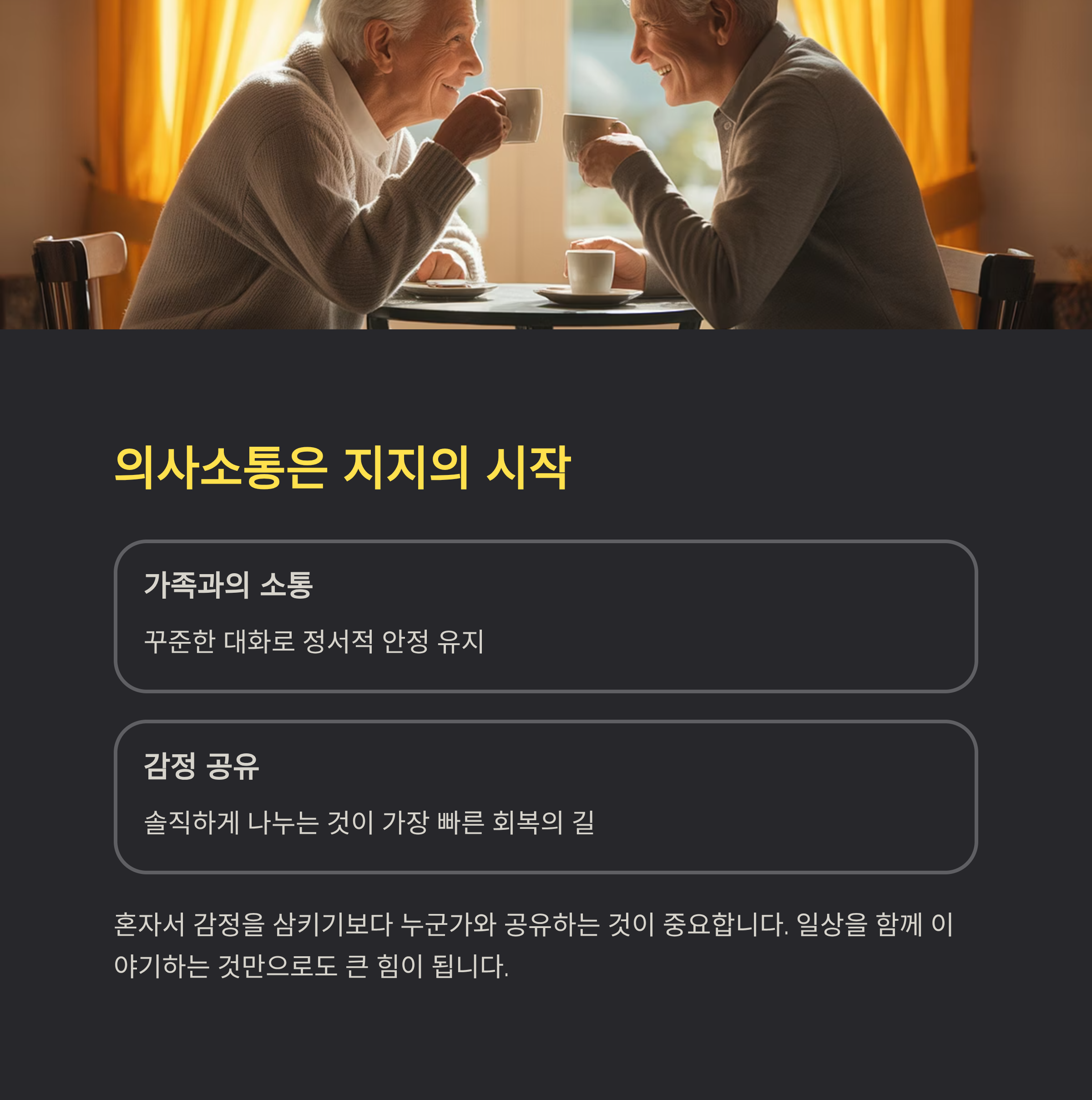 가족, 친구와의 꾸준한 소통은 가장 기본이면서도 가장 강력한 지지망입니다. 은퇴 후 본인의 감정을 솔직하게 나누는 것, 함께 일상을 이야기하는 것만으로도 정서적 안정을 유지할 수 있습니다. 특히 혼자서 감정을 삼키기보다, 누군가와 공유하는 것이 가장 빠른 회복의 길입니다.