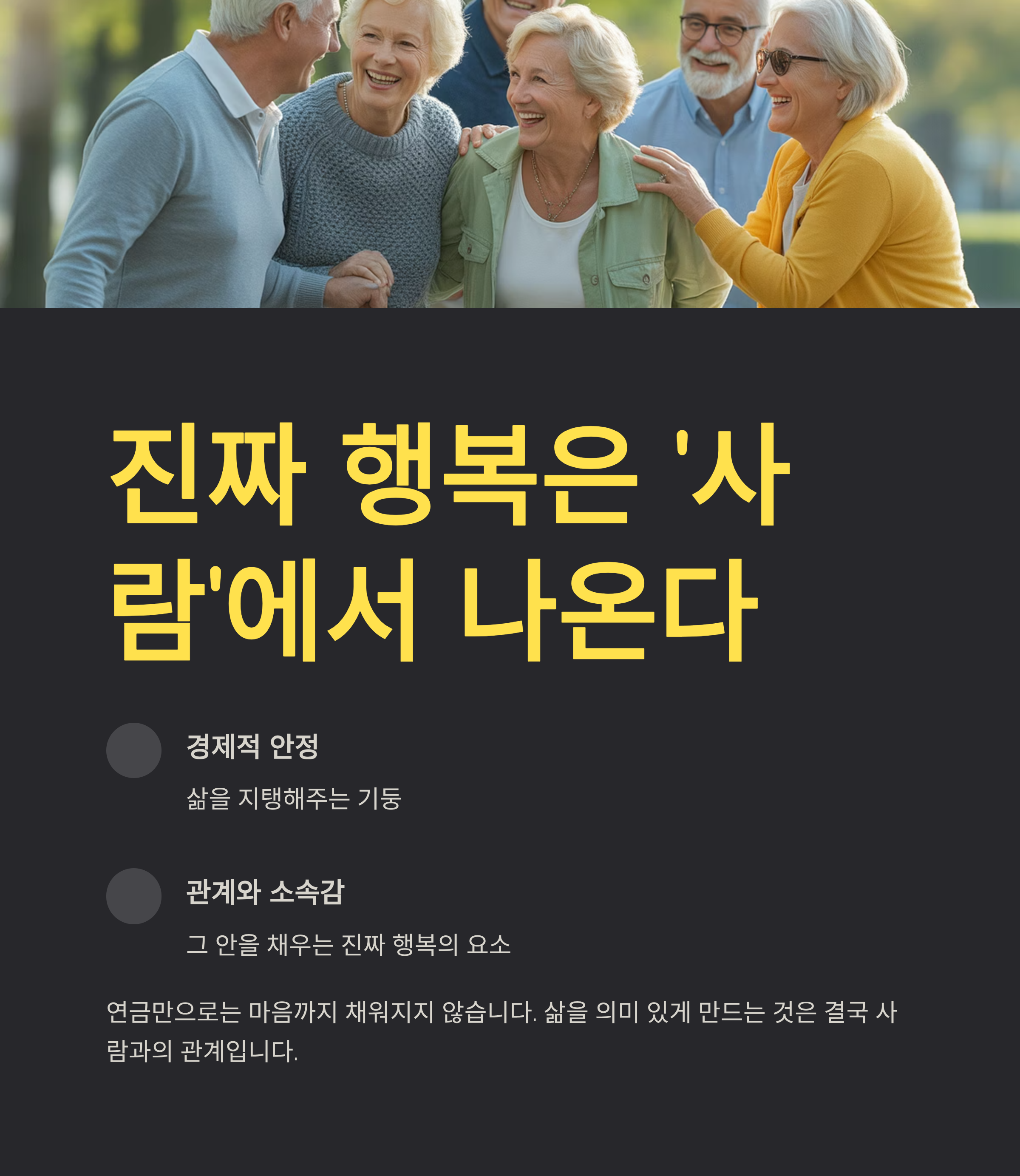 경제적 안정만으로는 마음까지 채워지지 않습니다. 삶을 의미 있게 만드는 것은 결국 사람과의 관계, 그리고 내가 하루를 왜 살아가는지에 대한 이유입니다. 연금은 삶을 지탱해주는 기둥이지만, 그 안을 채우는 것은 사람, 관계, 소속감이라는 사실을 잊지 마세요.