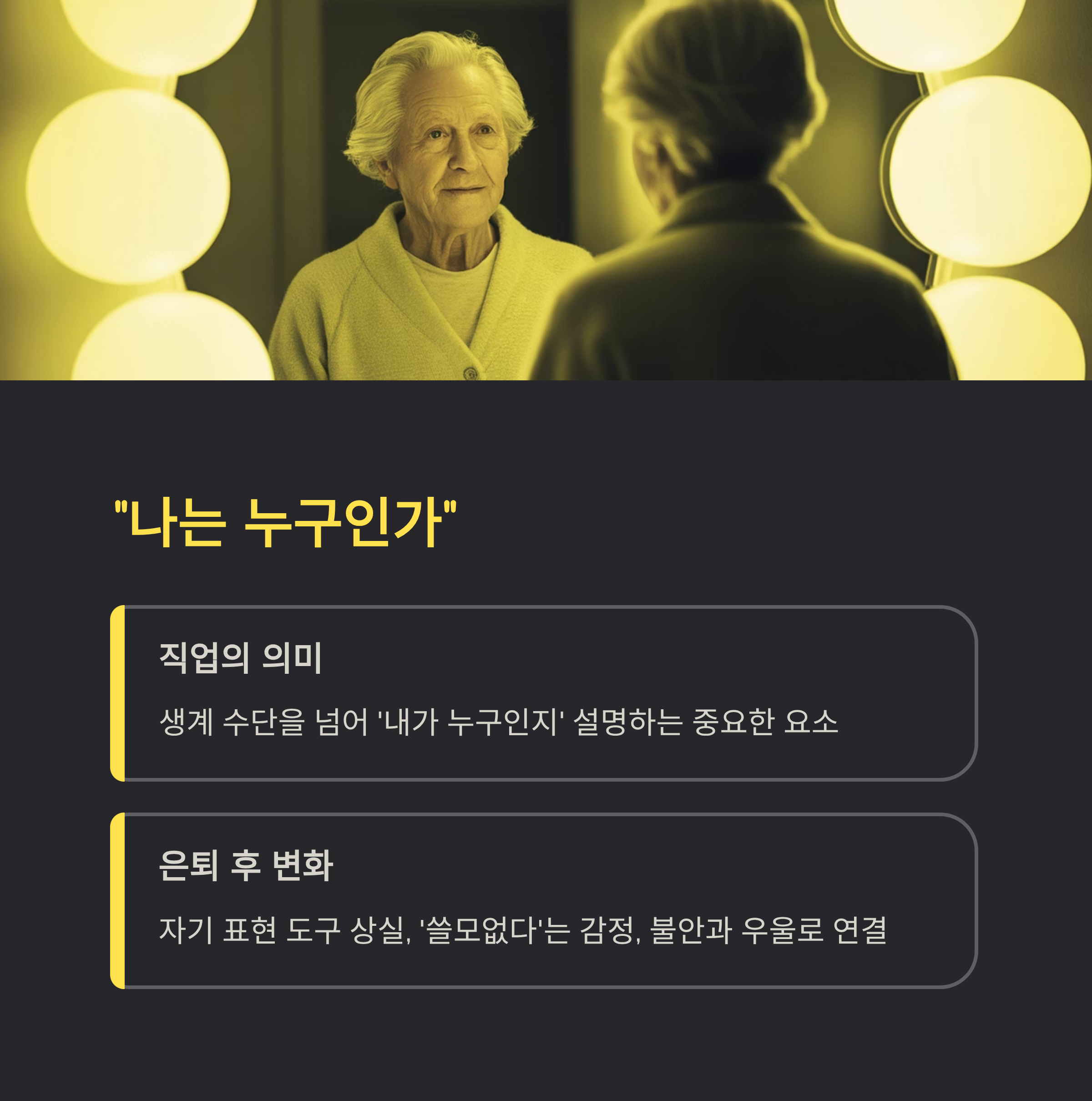직업이란 단순한 생계 수단이 아니라 ‘내가 누구인지’를 설명해주는 중요한 요소입니다. 하지만 은퇴 후에는 이러한 설명 도구가 사라지면서 자신을 표현하기 어려워지고, 스스로를 ‘쓸모없다’고 느끼는 경우도 많습니다. 이것이 불안과 우울로 연결되는 이유입니다.