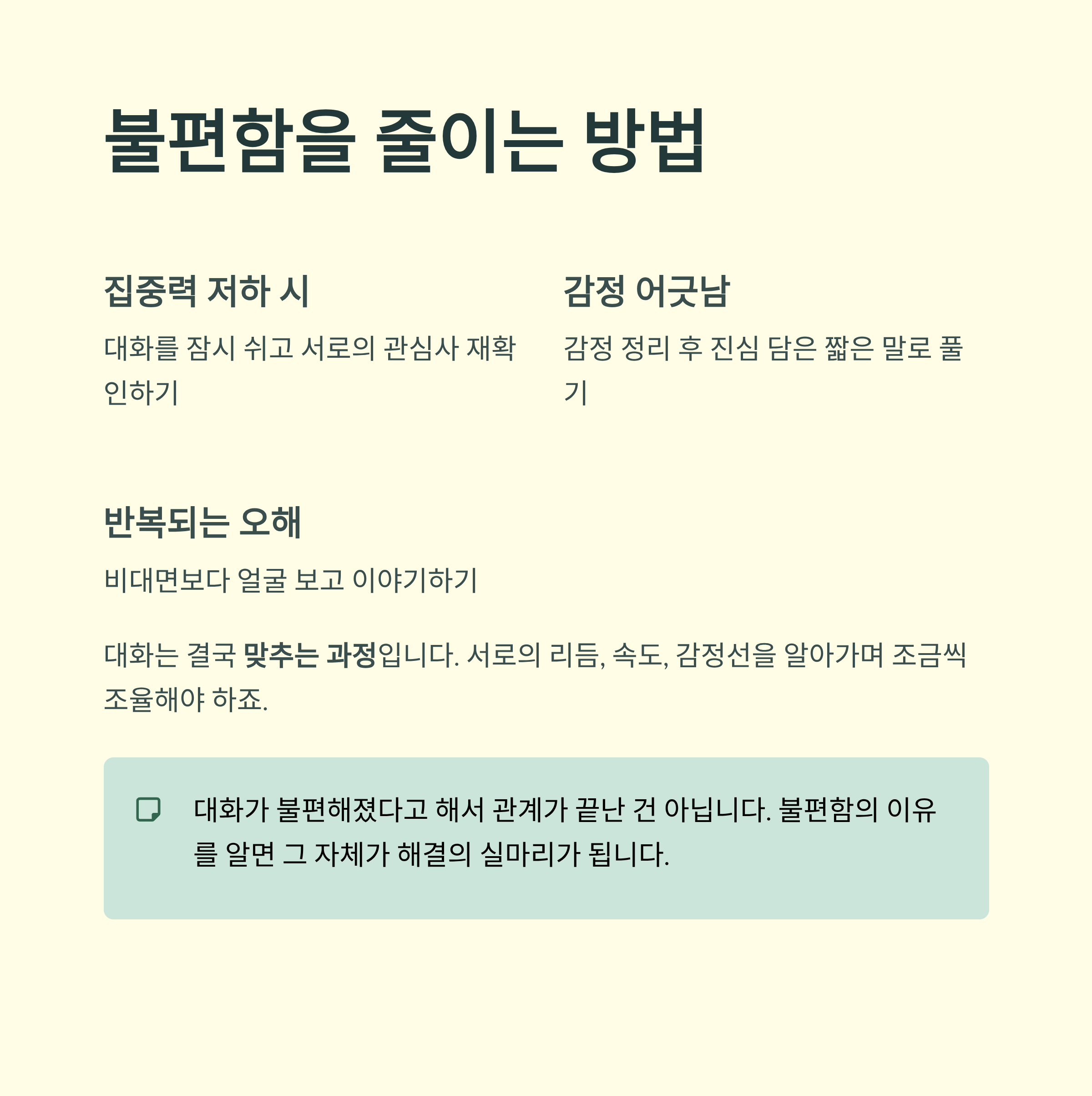 | 오해가 반복될 때 | 가능하면 비대면보다는 얼굴 보고 이야기하기 |