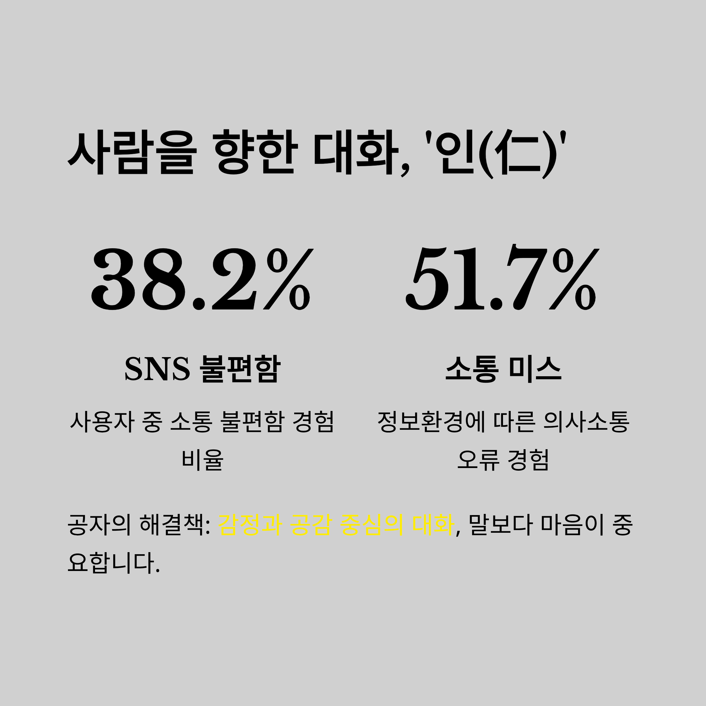 공자는 "인"을 인간 관계의 근본으로 두었습니다. 이는 상대를 사람으로 대하고, 감정과 공감으로 이어지는 커뮤니케이션을 강조하는 것입니다.