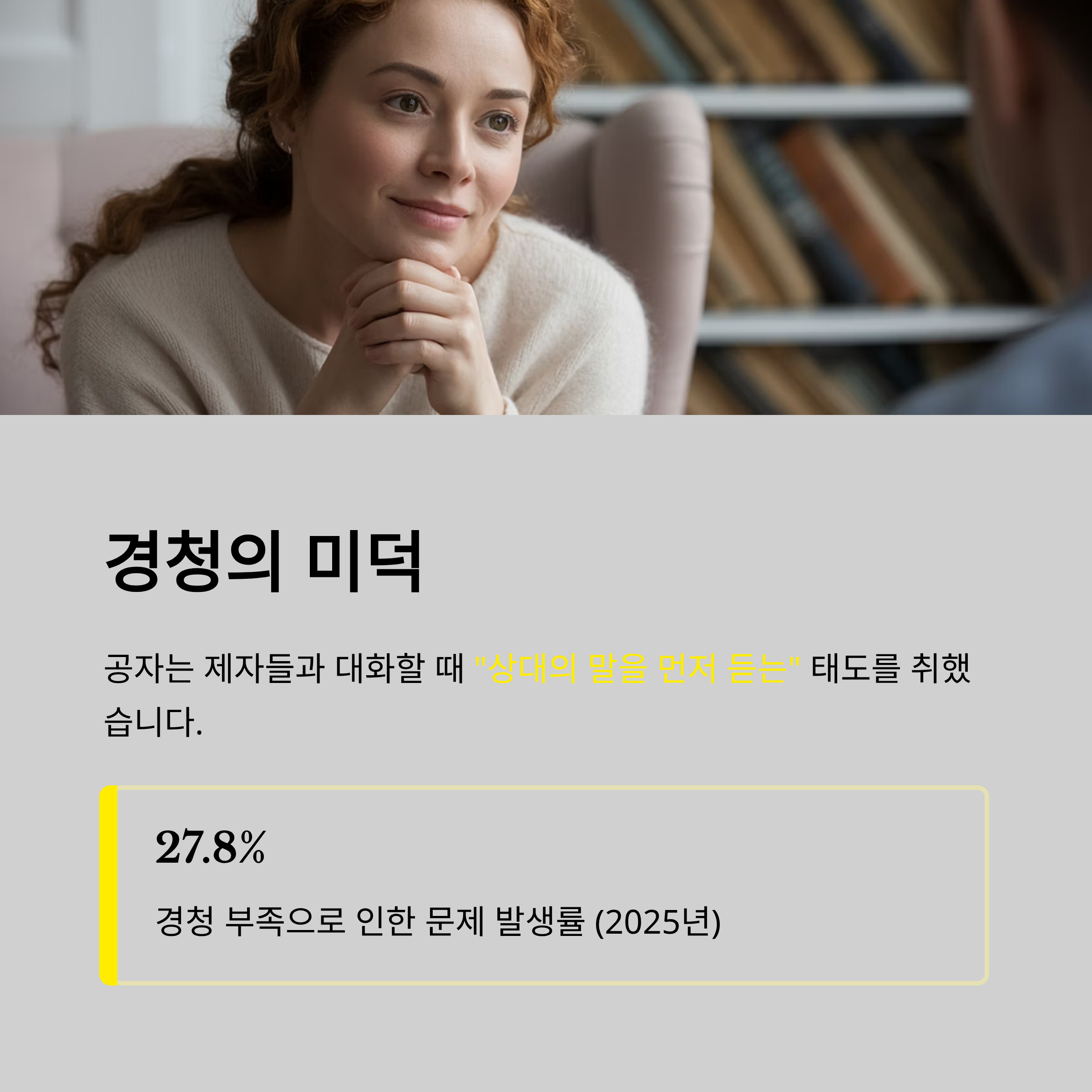 공자는 제자들과 대화할 때 말을 많이 하기보다 "상대의 말을 먼저 듣는" 태도를 취했습니다. 이를 통해 상대의 지혜와 마음을 더 정확히 파악하고, 진심을 담은 답을 할 수 있었습니다.