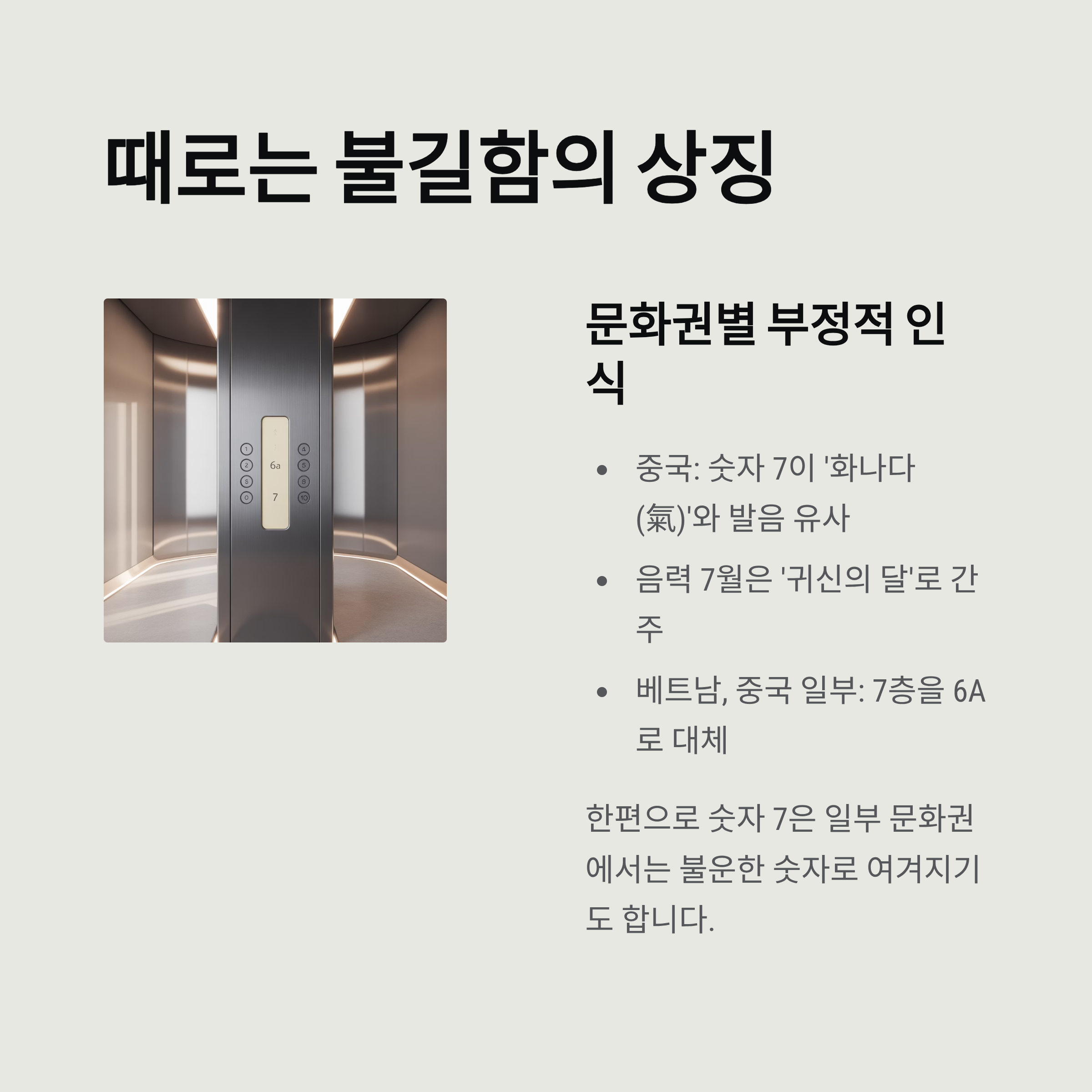 한편으로 숫자 7은 일부 문화권에서는 부정적인 인식도 함께 가지고 있습니다. 중국에서는 숫자 7이 ‘화나다(氣)’와 발음이 유사해 불운한 숫자로 여겨지며, 음력 7월은 ‘귀신의 달’로 간주됩니다. 베트남, 중국 일부 지역에서는 엘리베이터 층수에서 7층을 6A 등으로 대체하기도 합니다.