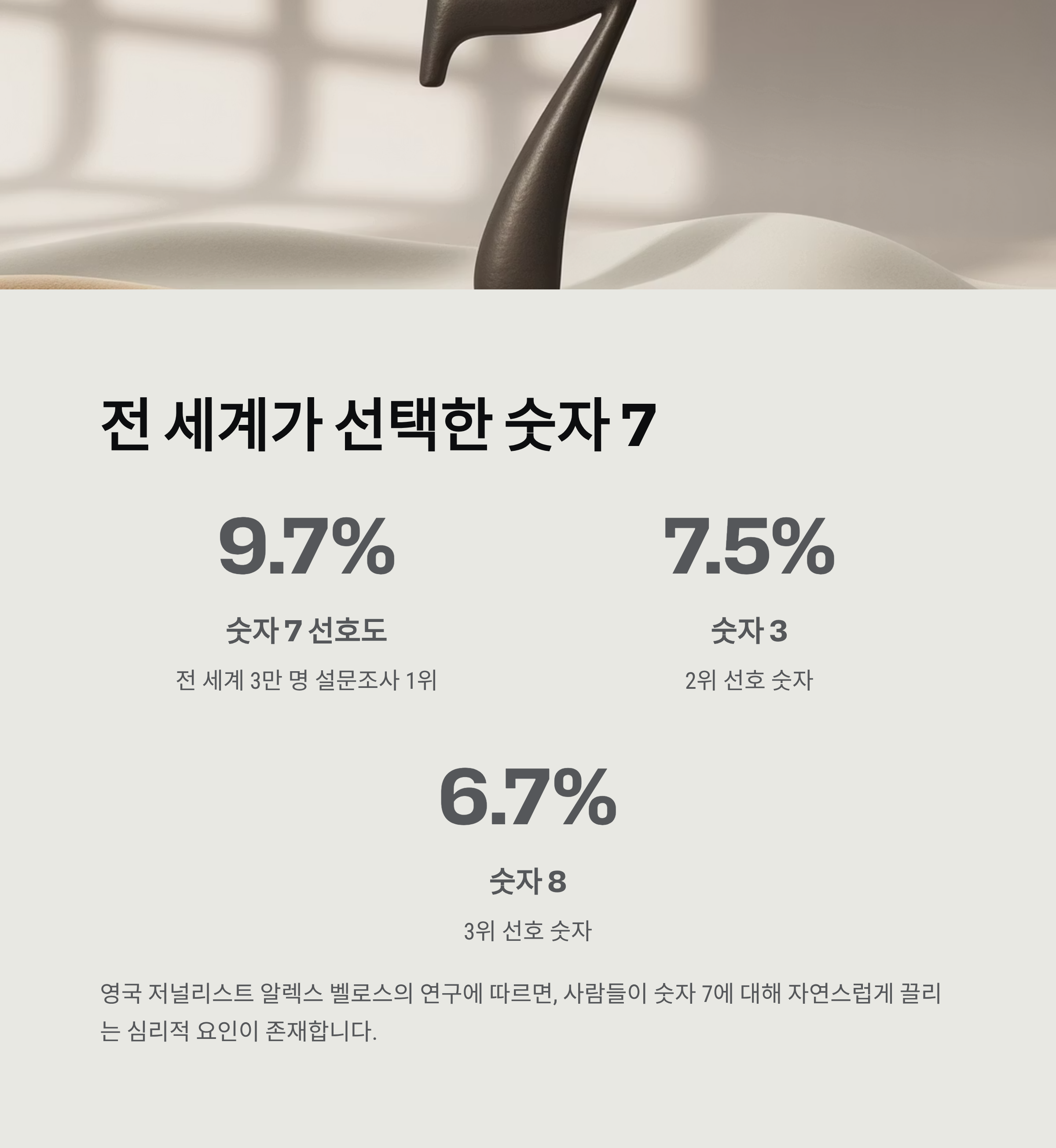 영국의 저널리스트 알렉스 벨로스는 전 세계 3만 명을 대상으로 한 온라인 설문조사에서 숫자 7이 가장 선호되는 숫자로 나타났다고 발표했습니다. 전체 응답자 중 9.7%가 7을 선택했으며, 그 뒤를 3(7.5%)과 8(6.7%)이 따랐습니다. 이는 단순한 우연이 아닌, 사람들이 숫자 7에 대해 자연스럽게 끌리는 심리적 요인이 있음을 보여줍니다.