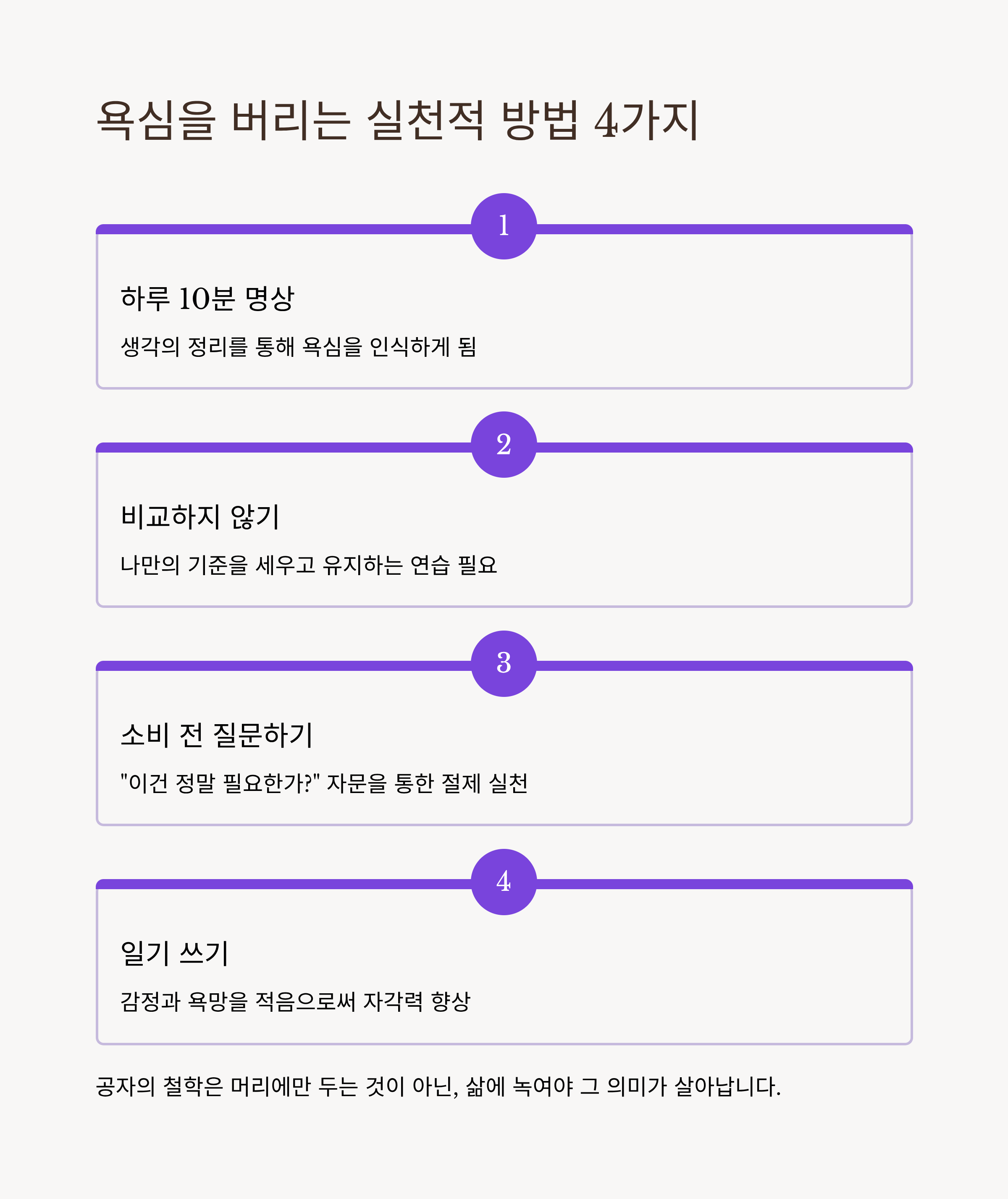 그가 경계한 욕심은 단순한 소유욕이 아니라, 자기 성찰을 방해하고 타인과의 조화를 무너뜨리는