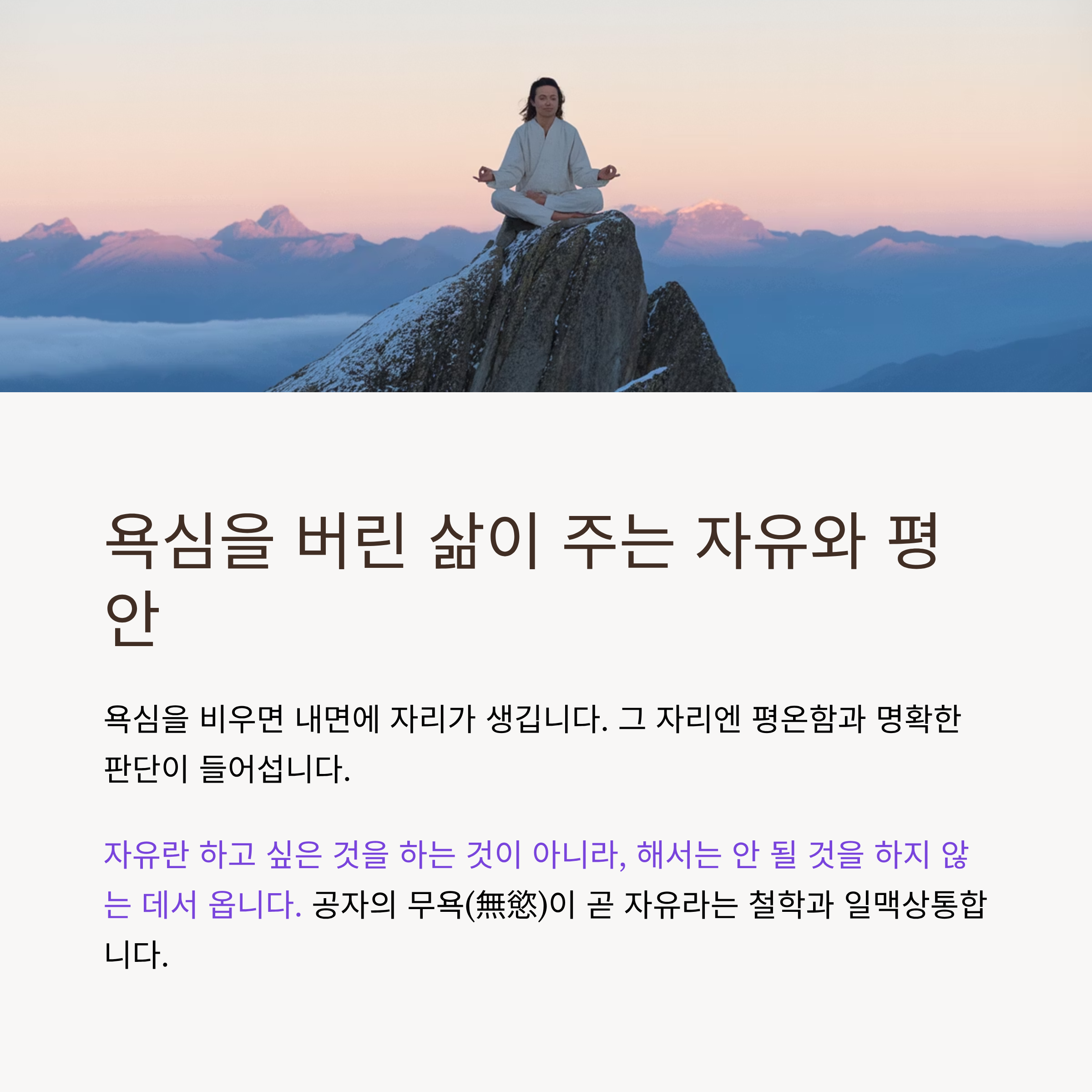 공자는 군자의 삶을 통해 이를 설명하며, 무욕이 곧 자유라는 철학을 펼쳤습니다.