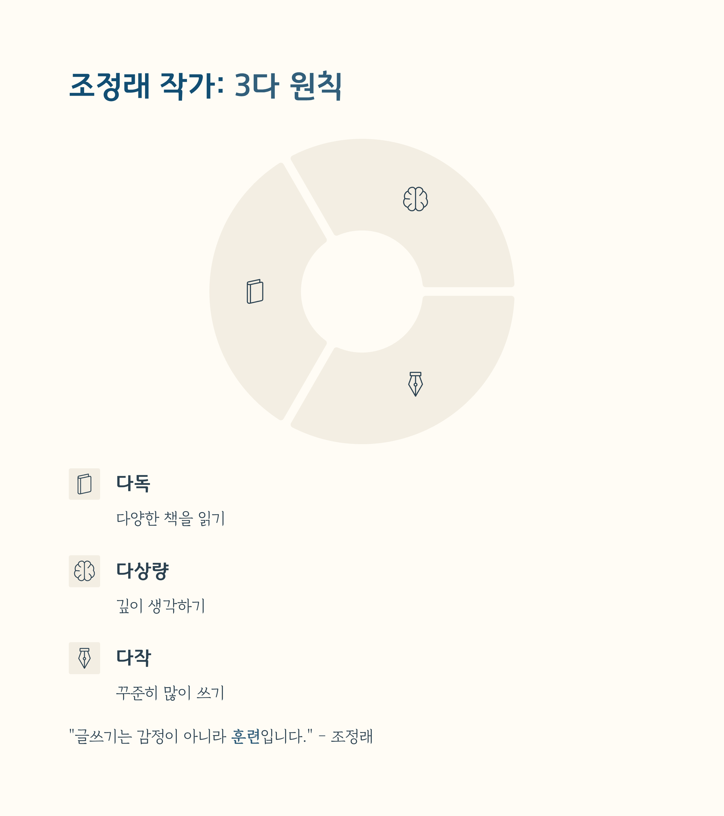 | 조정래 작가 | 감정과 무관한 규칙적 글쓰기 | 꾸준한 생산성과 내공 축적 |