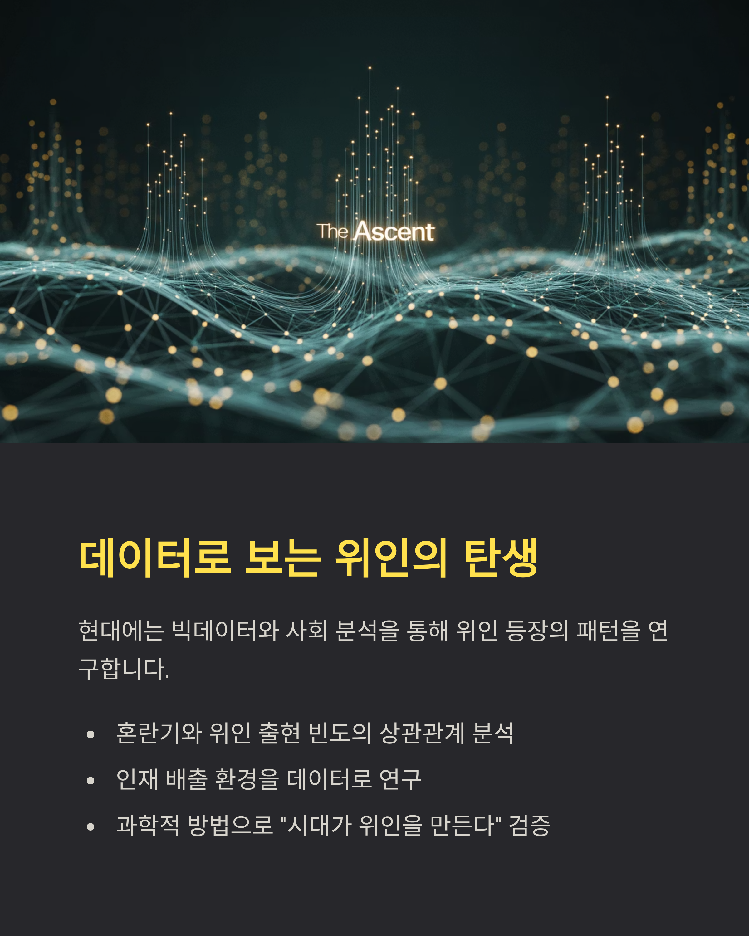 오늘날에는 빅데이터와 사회 분석을 통해서도 위인의 등장을 이해하려는 시도가 있습니다. 예컨대 혼란기와 위인의 출현 빈도 간 상관관계를 통계적으로 밝히거나, 인재 배출 환경을 데이터로 분석하는 연구가 진행되고 있습니다. 이는 전통적인 역사관을 넘어 과학적 방법으로도 “시대가 위인을 만든다”는 명제를 확인하려는 흐름입니다.