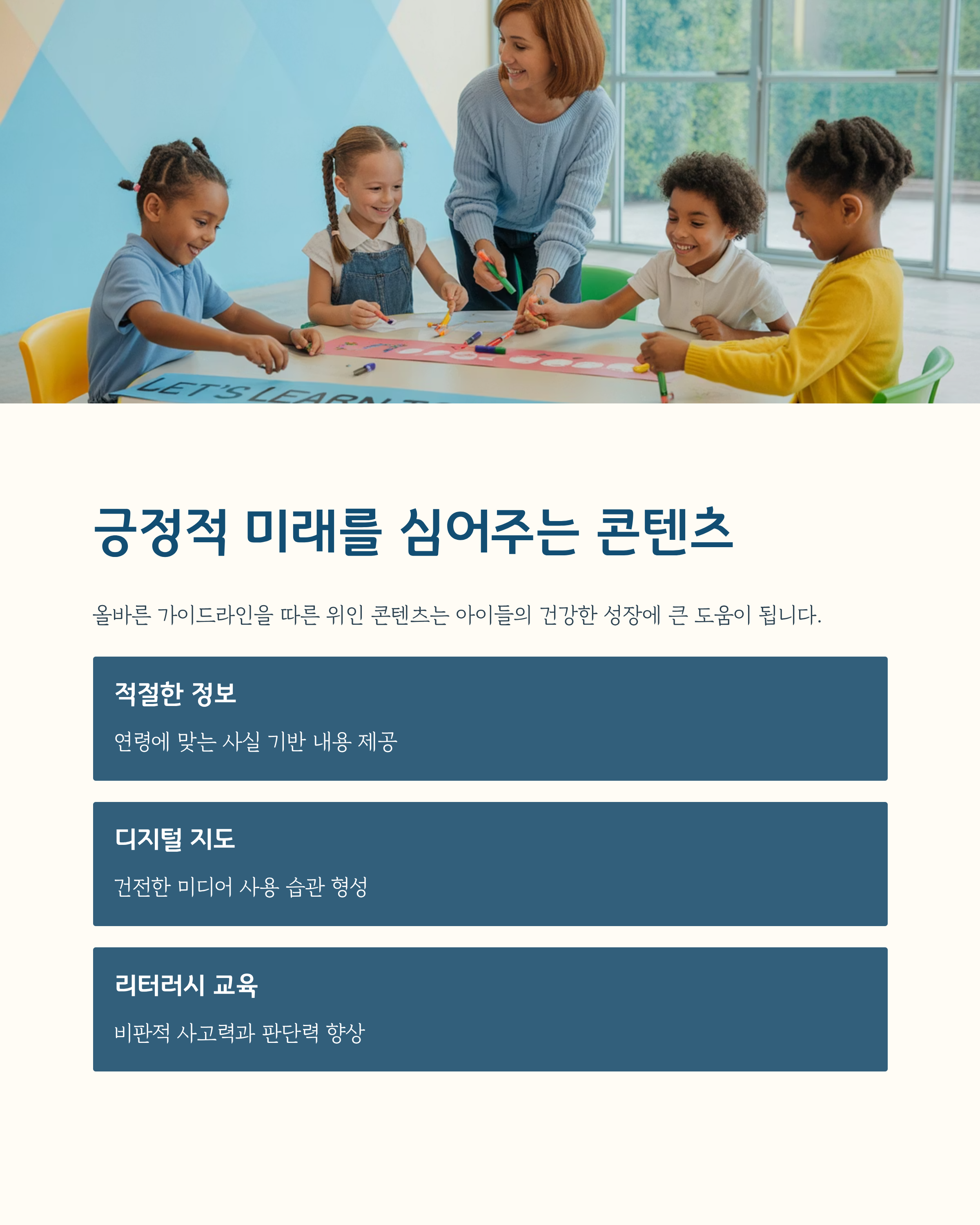 스마트폰과 태블릿을 통해 아이들이 콘텐츠를 접하는 시간이 늘어나면서 과도한 미디어 몰입이 우려되고 있습니다. 미국소아과학회는 2세 이상 아동의 경우 하루 1시간 이내의 시청을 권고하고 있는데요. 따라서 콘텐츠 제작자는 아동의 연령과 발달 수준에 맞는 분량과 형식을 고려해야 합니다. 부모나 교사가 아이와 함께 콘텐츠를 활용하고, 시간을 관리할 수 있도록 돕는 구조가 필요합니다.