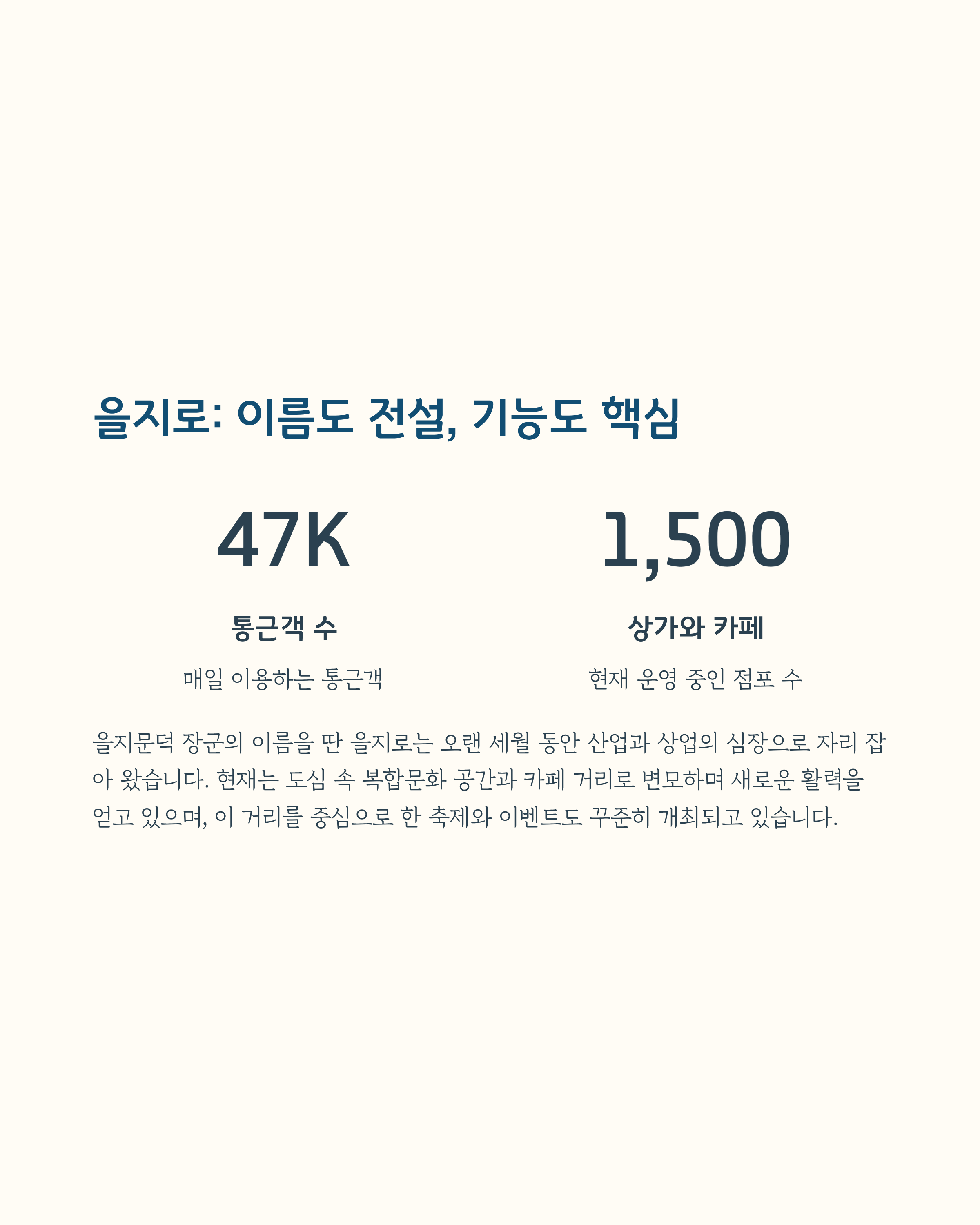 | 을지로 | 을지문덕 장군 | 47,000명 | 1,500여 상가 |