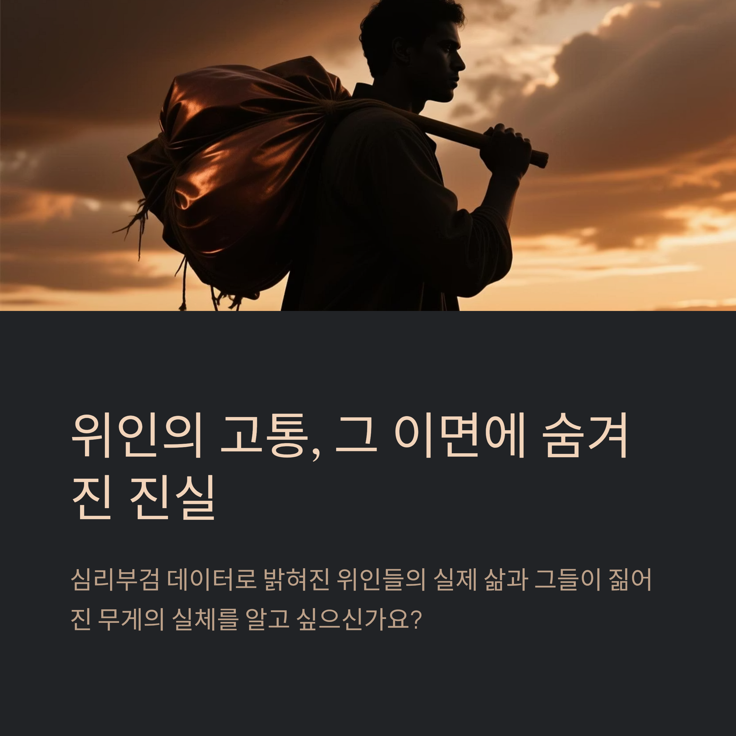 위인이라는 이름은 단순히 존경의 상징을 넘어, 그들이 짊어진 고통과 책임의 무게까지 함께 담겨 있습니다. 최근 심리부검 연구와 사회적 통계는 현대인이 겪는 고통의 양상과 구조를 보여주며, 위인의 삶이 결코 특별한 개인만의 문제가 아니라 사회적 맥락 속에서 재구성된다는 점을 밝혀주고 있습니다. 본문에서는 위인의 고통을 심리학, 사회학, 신경과학적 데이터와 연결해 풀어가며 그 의미를 되짚어보겠습니다.