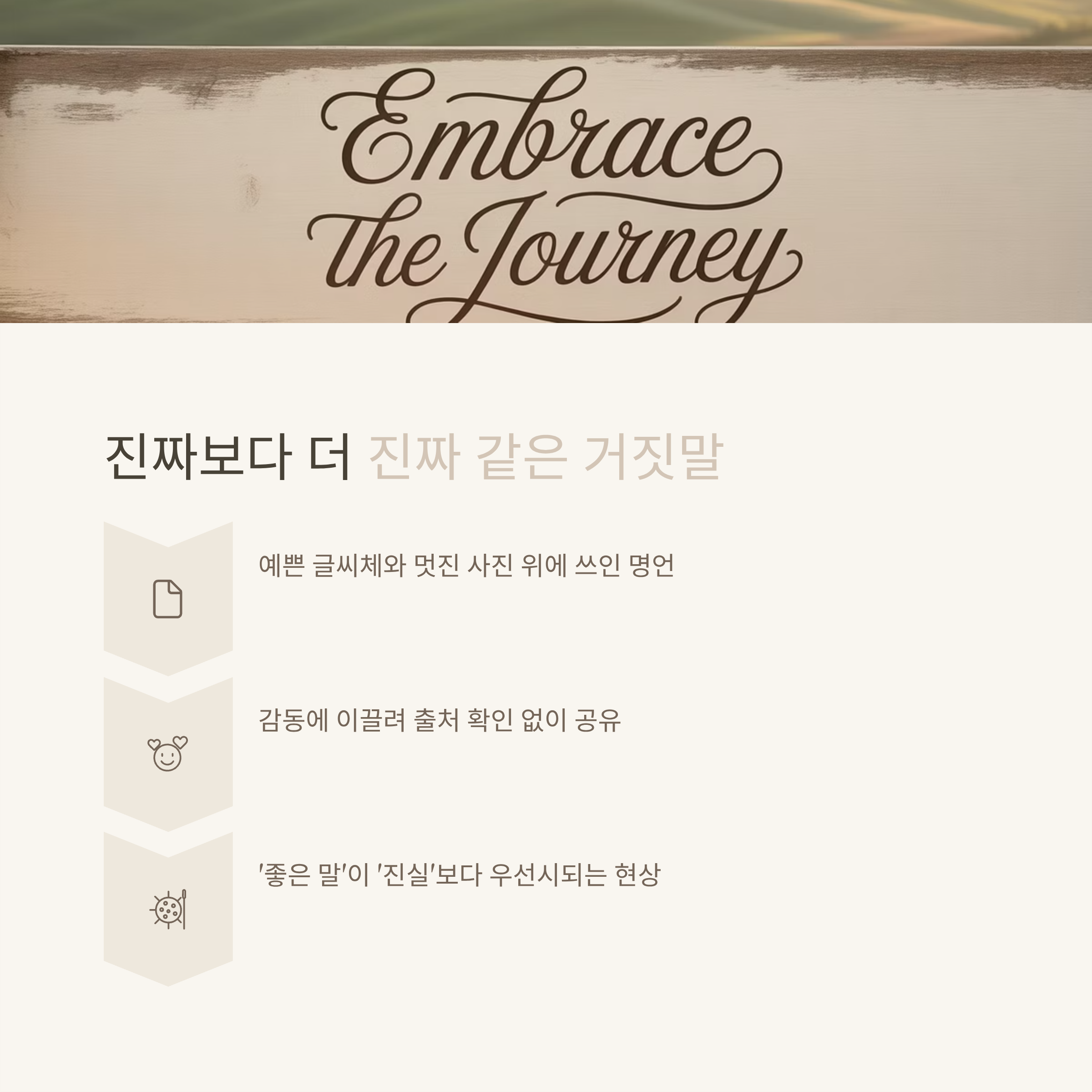 이 과정을 생략하면, 단지 ‘좋은 말’이라는 이유만으로 가짜 정보를 확산시키는 셈이 됩니다.