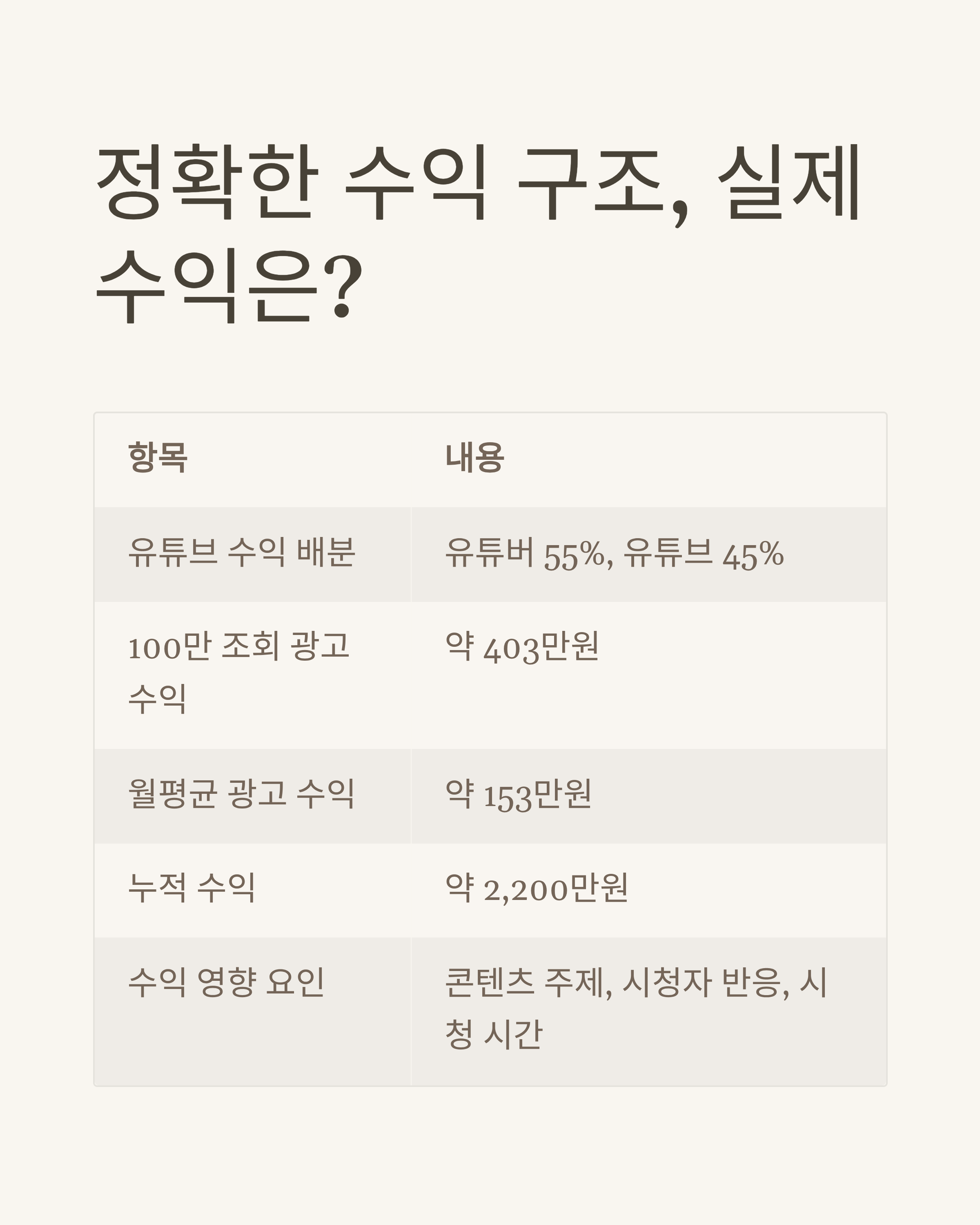 | 수익 영향 요인 | 콘텐츠 주제, 시청자 반응, 시청 시간 등 |