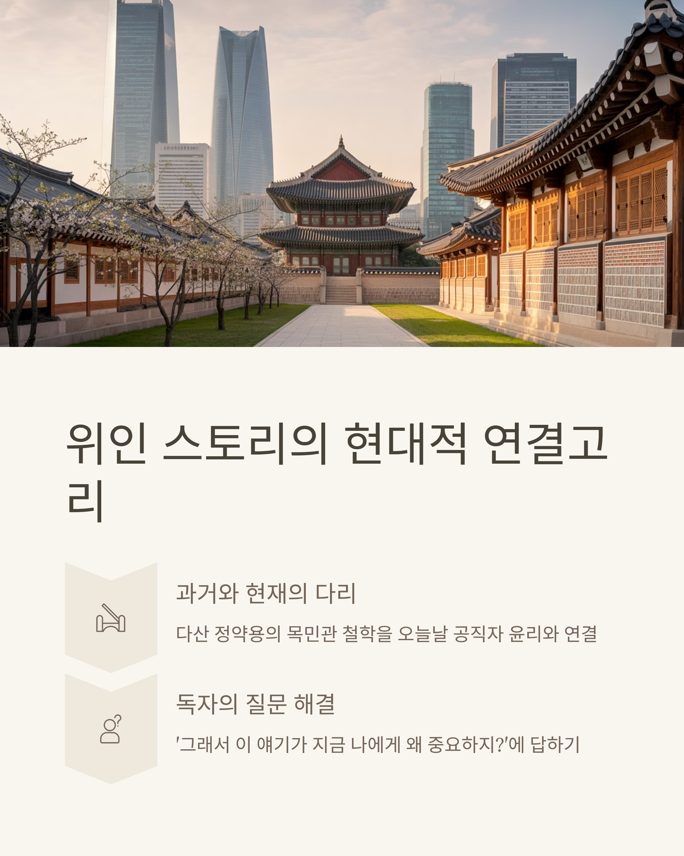 ‘현대적 가치 연결’이 필요합니다. 예를 들어 다산 정약용의 목민관 철학을 통해 오늘날 공직자의 윤리 문제, 시민 서비스 이슈와 연결시키면 현실과 역사 사이의 다리가 만들어집니다. 독자는 ‘그래서 이 얘기가 지금 나에게 왜 중요하지?’라는 질문에 자연스럽게 답을 얻게 됩니다.