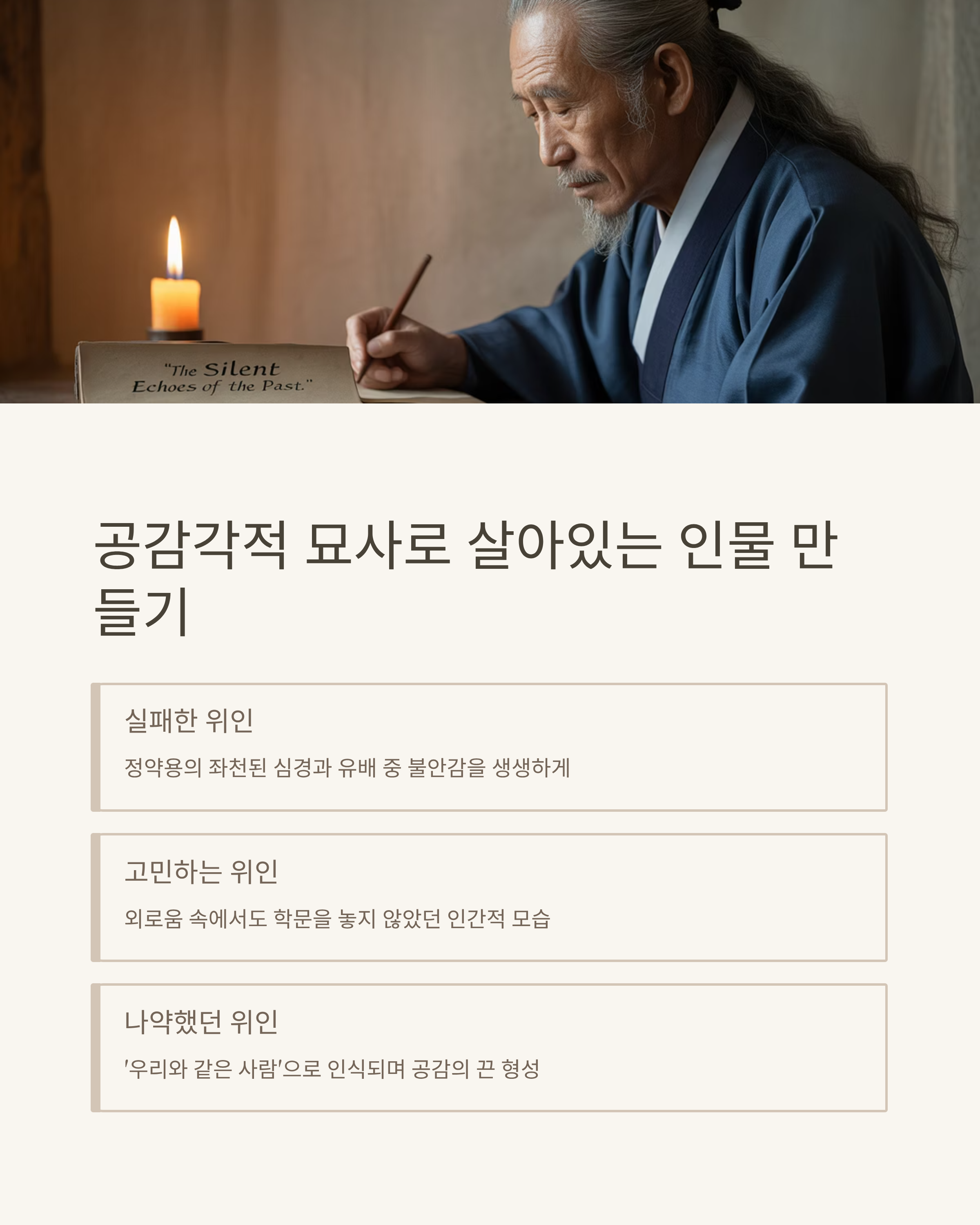 | 감정·공감 요소 | 인물 내면 묘사 | 정약용의 유배 중 불안 |