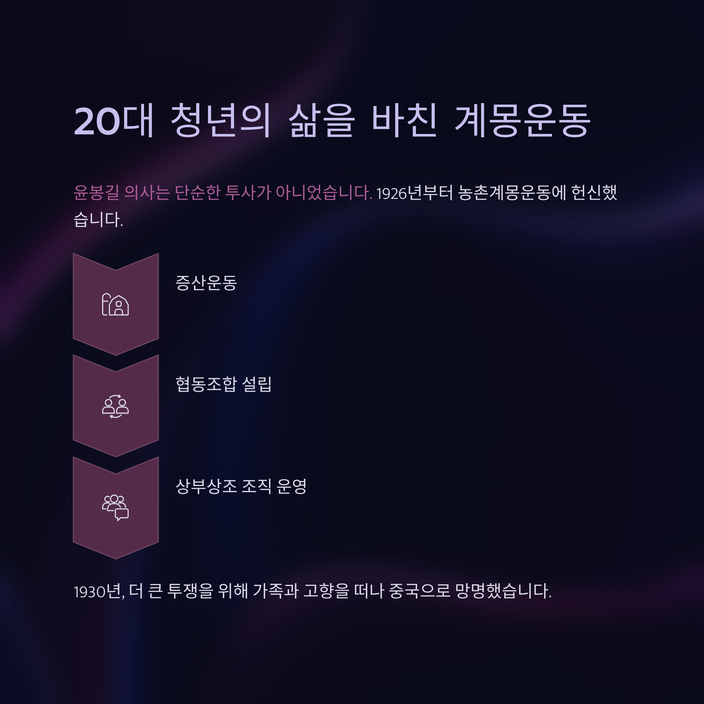 1927년과 1929년, 그는 다양한 농민단체를 조직하며 삶으로 독립을 실천했고, 그 와중에 일본 경찰에게 체포되어 3주간의 옥고를 치렀습니다.