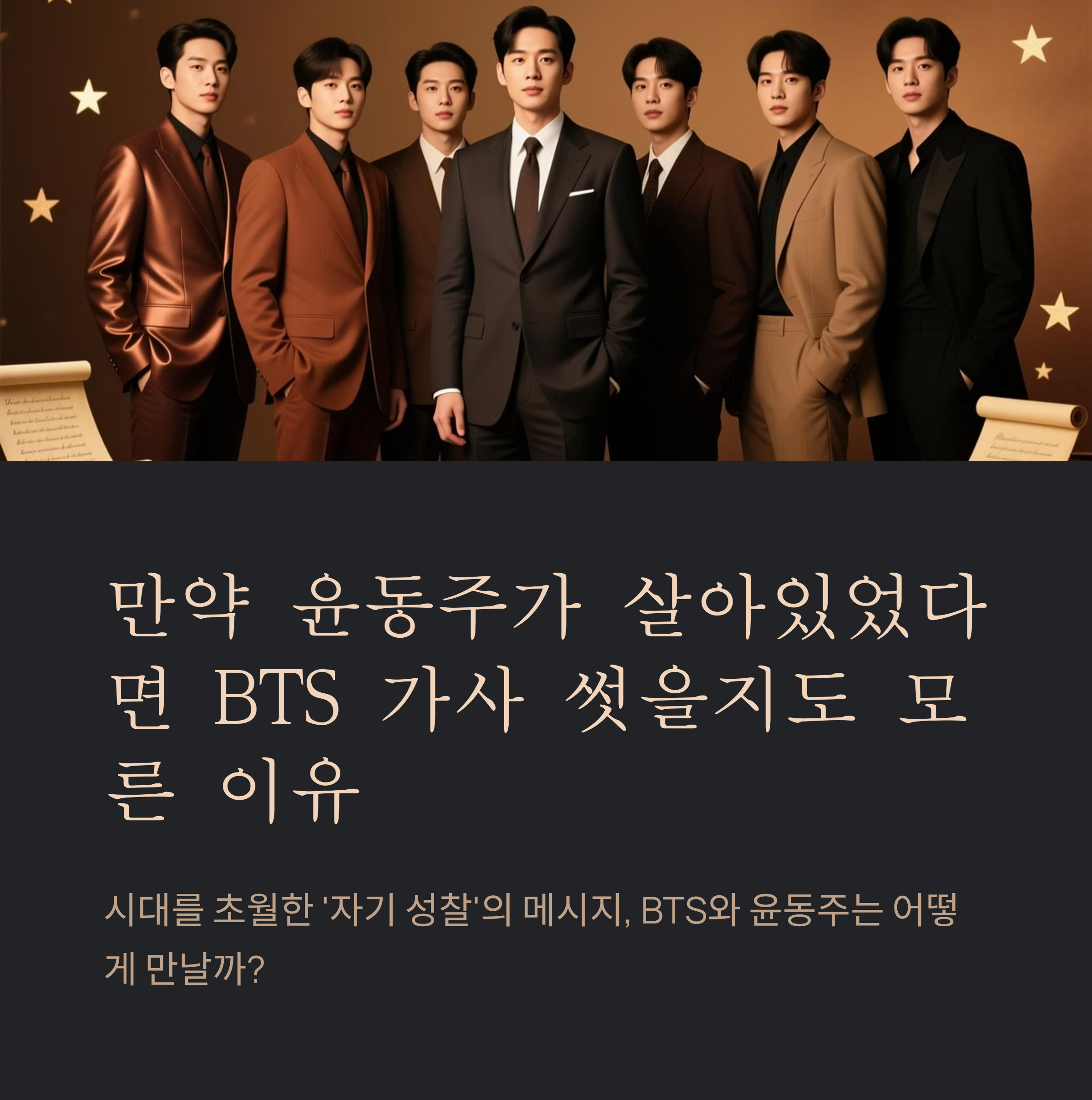 최근 출간된 『BTS, 윤동주를 만나다』는 시와 가사, 문학과 음악이라는 서로 다른 장르를 연결하며 새로운 관점을 제시하고 있습니다. 윤동주의 시와 BTS의 가사는 각기 다른 시대와 배경을 갖고 있음에도 불구하고, 청춘의 고뇌와 자기 성찰, 희망이라는 주제를 중심으로 놀랍도록 유사한 감성 코드를 공유하고 있습니다. 윤동주가 오늘날 살아있었다면 BTS의 노래 가사에 깊이 공감했을 것이라는 주장, 단순한 상상이 아니라 데이터를 기반으로 한 분석에서 비롯된 통찰입니다.