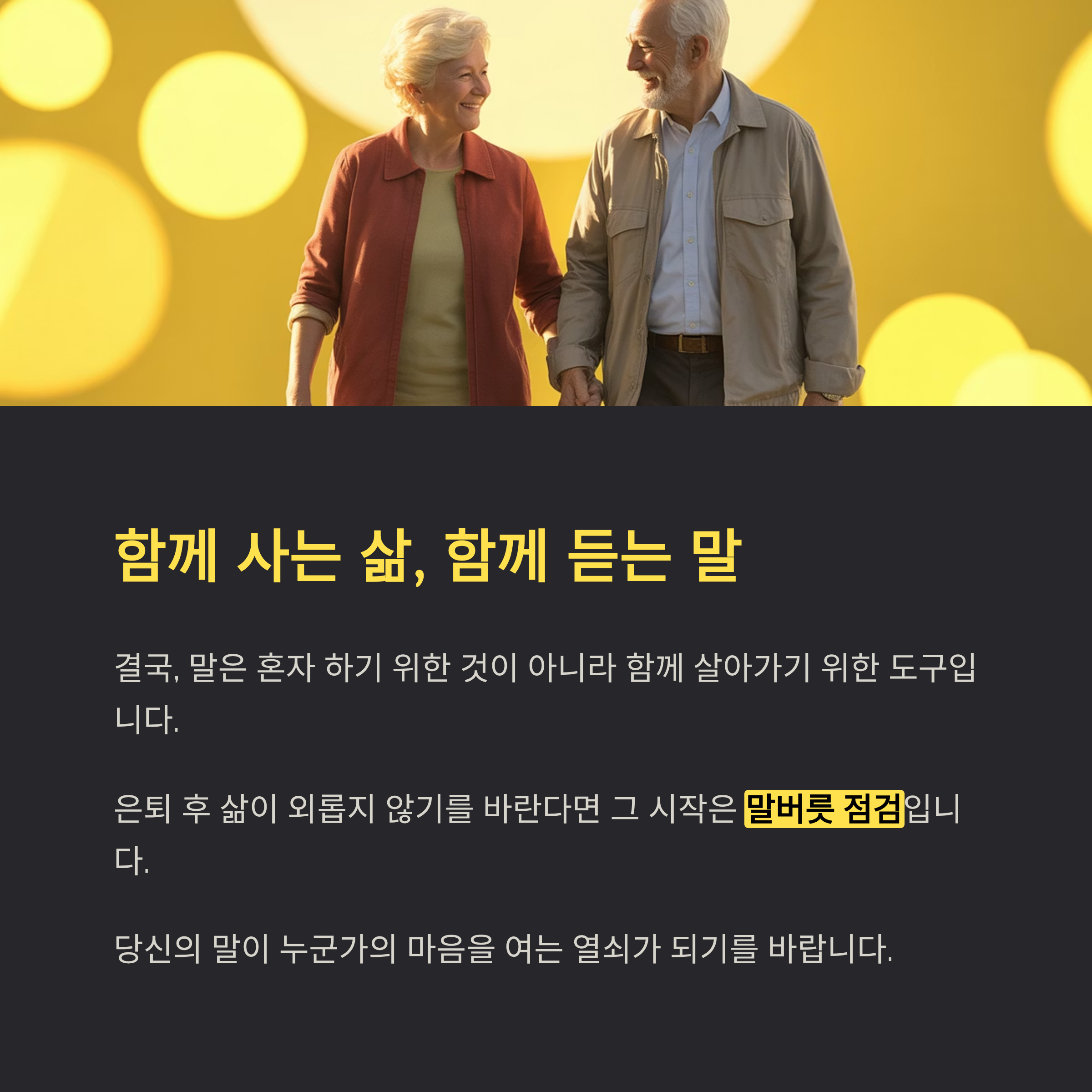 은퇴는 단순히 일을 그만두는 게 아닙니다. 이제부터는 ‘사람과의 관계’가 삶의 질을 좌우하게 되죠. 그런데 오랜 사회생활 속에서 무심코 굳어진 말버릇이 문제를 만들기도 합니다. 특히 가족, 친구, 이웃과의 새로운 관계를 망칠 수도 있는 표현들. 지금부터 은퇴 전 꼭 바꿔야 할 말버릇 3가지를 살펴보며, 더 나은 인생 2막을 준비해보세요.