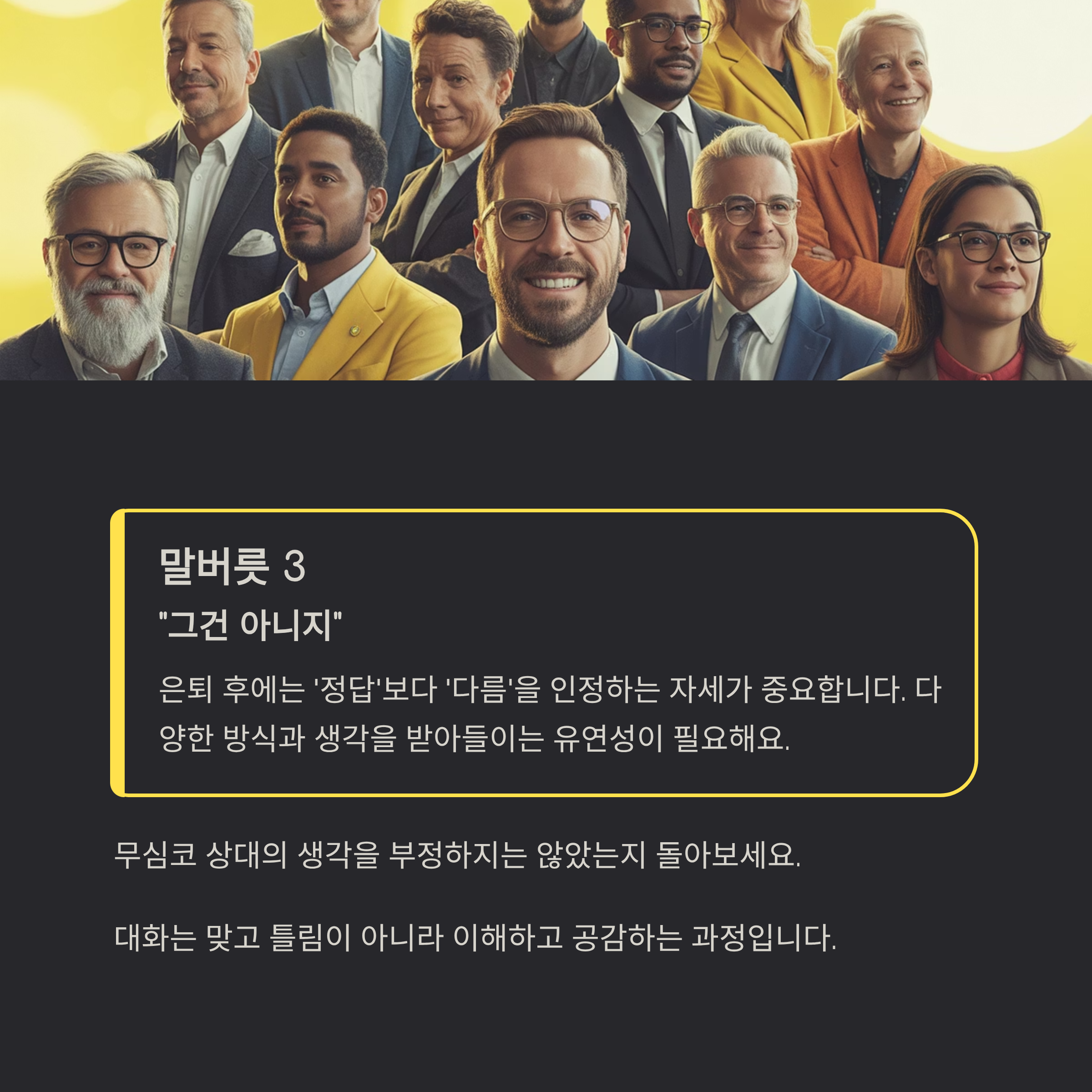은퇴 후에는 '정답'보다 '다름'을 인정하는 자세가 중요해요.
