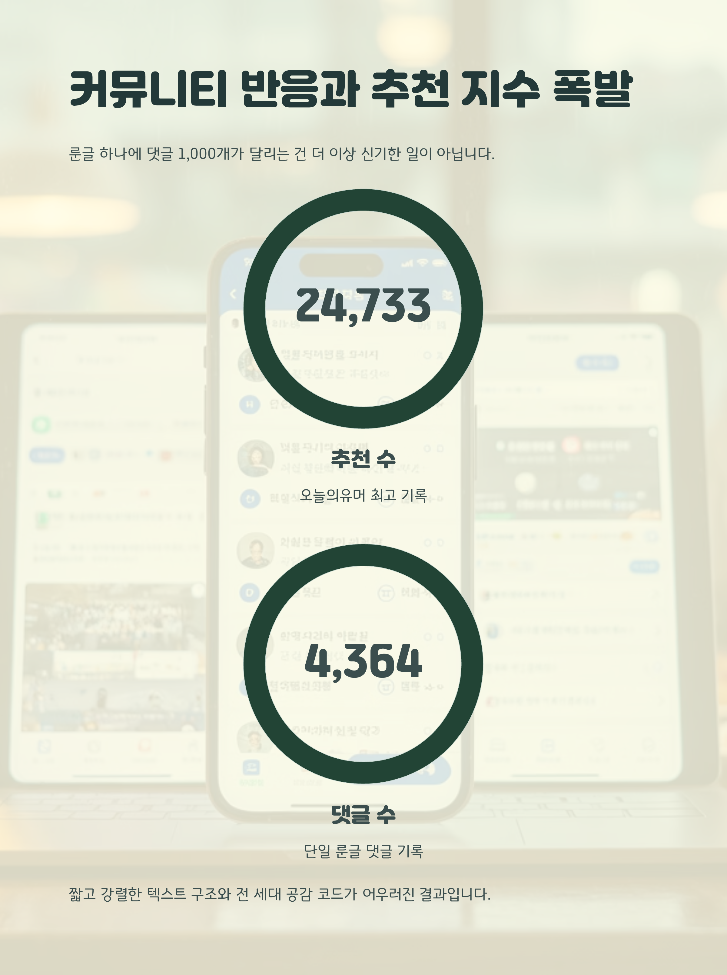 룬글 하나에 댓글 1,000개가 달리는 건 더 이상 신기한 일이 아닙니다. 실제로 '오늘의유머' 같은 소규모 커뮤니티에서도 2025년 3월 기준 추천 수 24,733건, 댓글 4,364건을 기록한 룬글이 존재합니다.