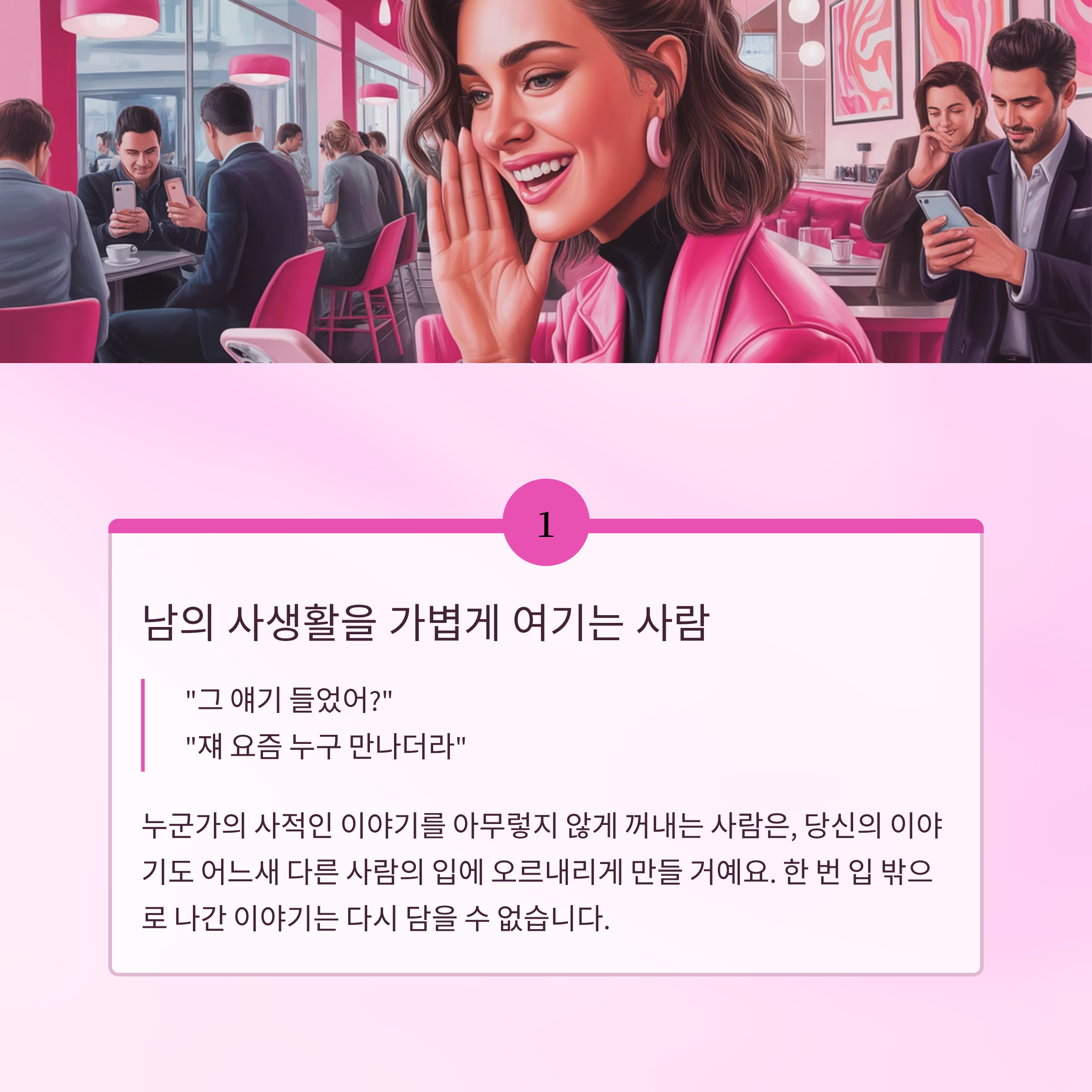 누군가의 사적인 이야기를 아무렇지 않게 꺼내는 사람은, 당신의 이야기도 어느새 다른 사람의 입에 오르내리게 만들 거예요. 한 번 입 밖으로 나간 이야기는 다시 담을 수 없습니다. 신뢰는 이런 순간들에서 무너집니다.