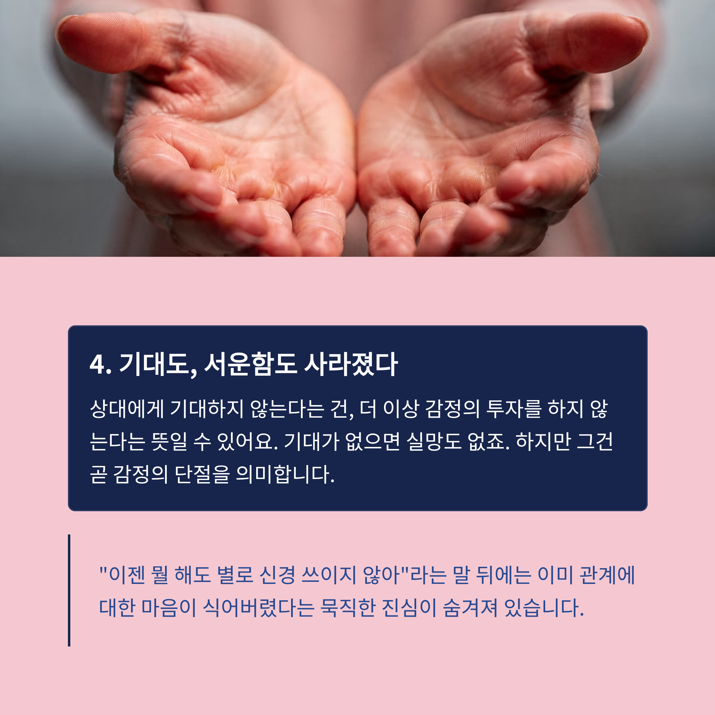 상대에게 기대하지 않는다는 건, 더 이상 감정의 투자를 하지 않는다는 뜻일 수 있어요.