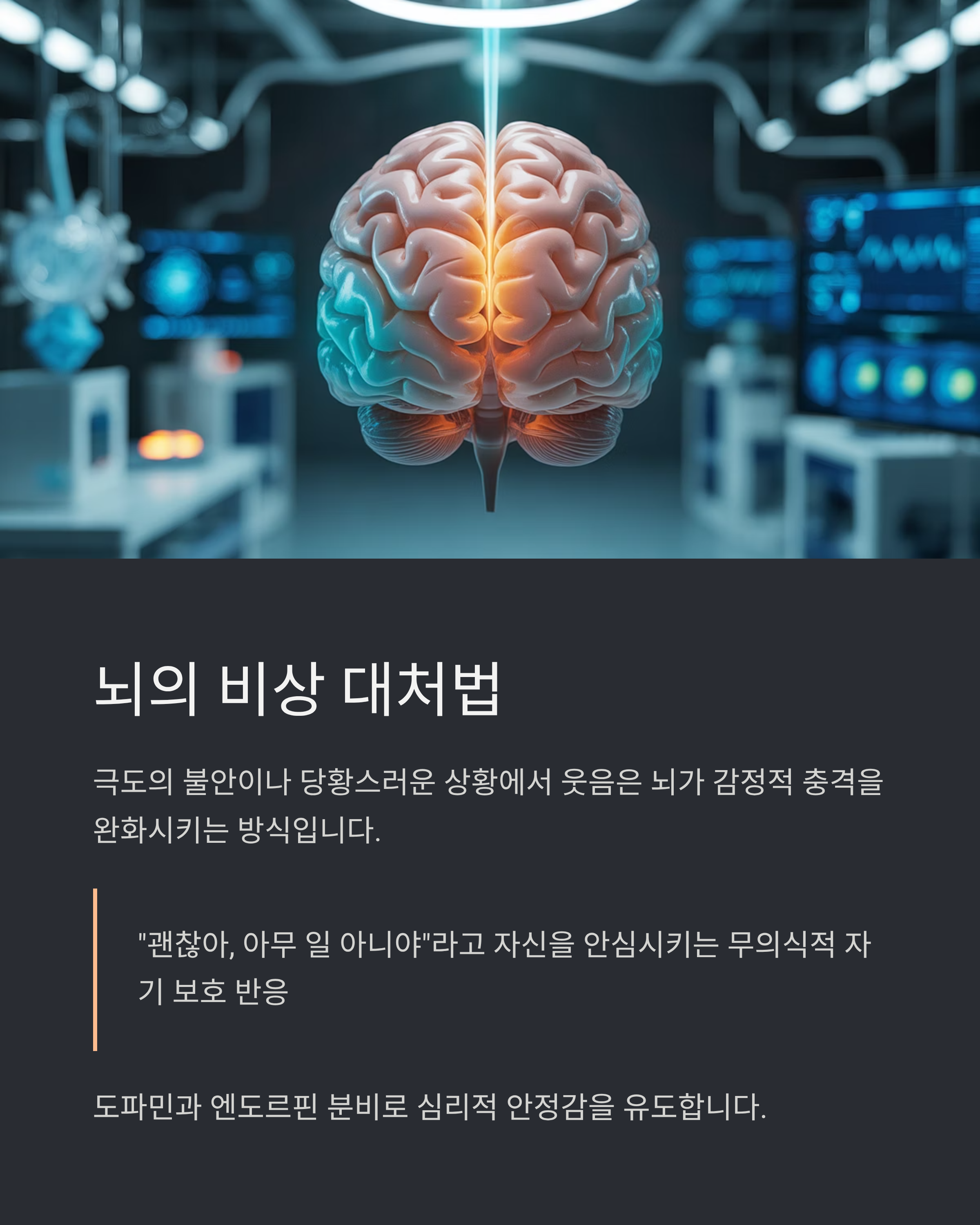 이는 뇌가 감정적 충격을 완화시키기 위해 긴장을 누그러뜨리는 방식인데, 마치 "괜찮아, 아무 일 아니야"라고 자신을 안심시키는 무의식적인 자기 보호 반응이기도 합니다. 특히 갑작스러운 두려움이나 낯선 상황에 직면했을 때, 뇌는 도파민이나 엔도르핀 분비를 통해 심리적 안정감을 유도하려 합니다.