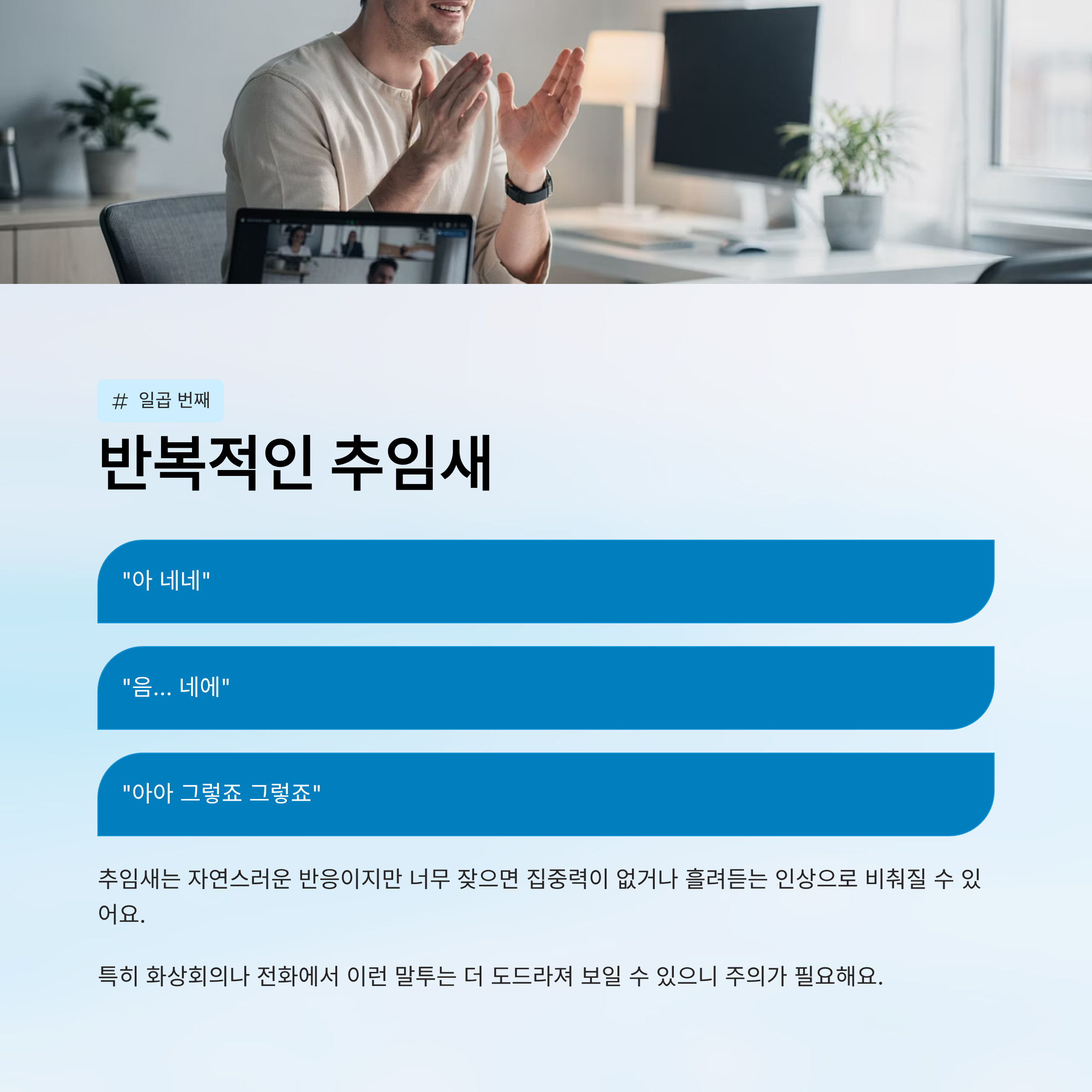 추임새는 자연스러운 반응이지만 너무 잦으면 집중력이 없거나 흘려듣는 인상으로 비춰질 수 있어요.