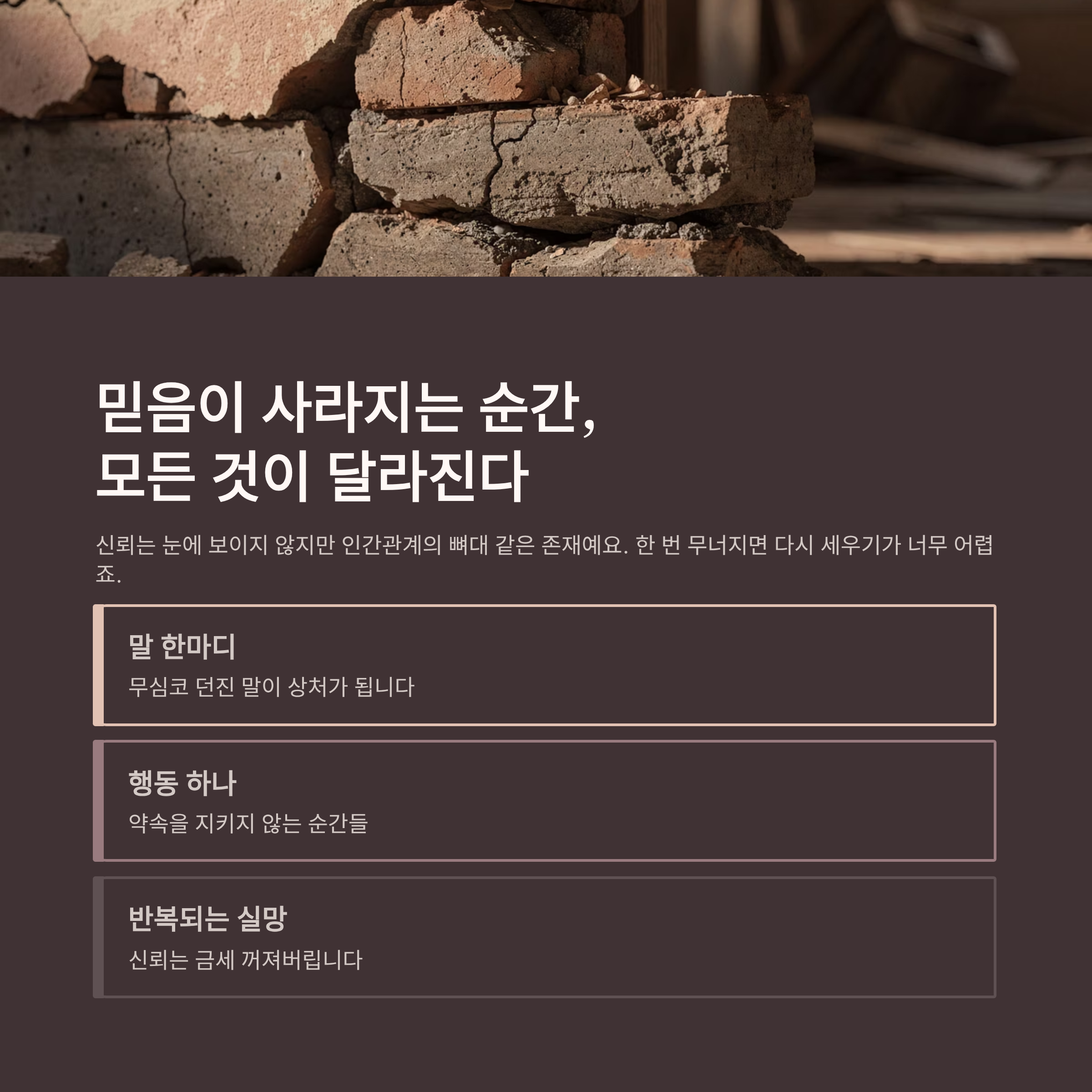 말 한마디, 행동 하나, 반복되는 실망에서 신뢰는 금세 꺼져버립니다.