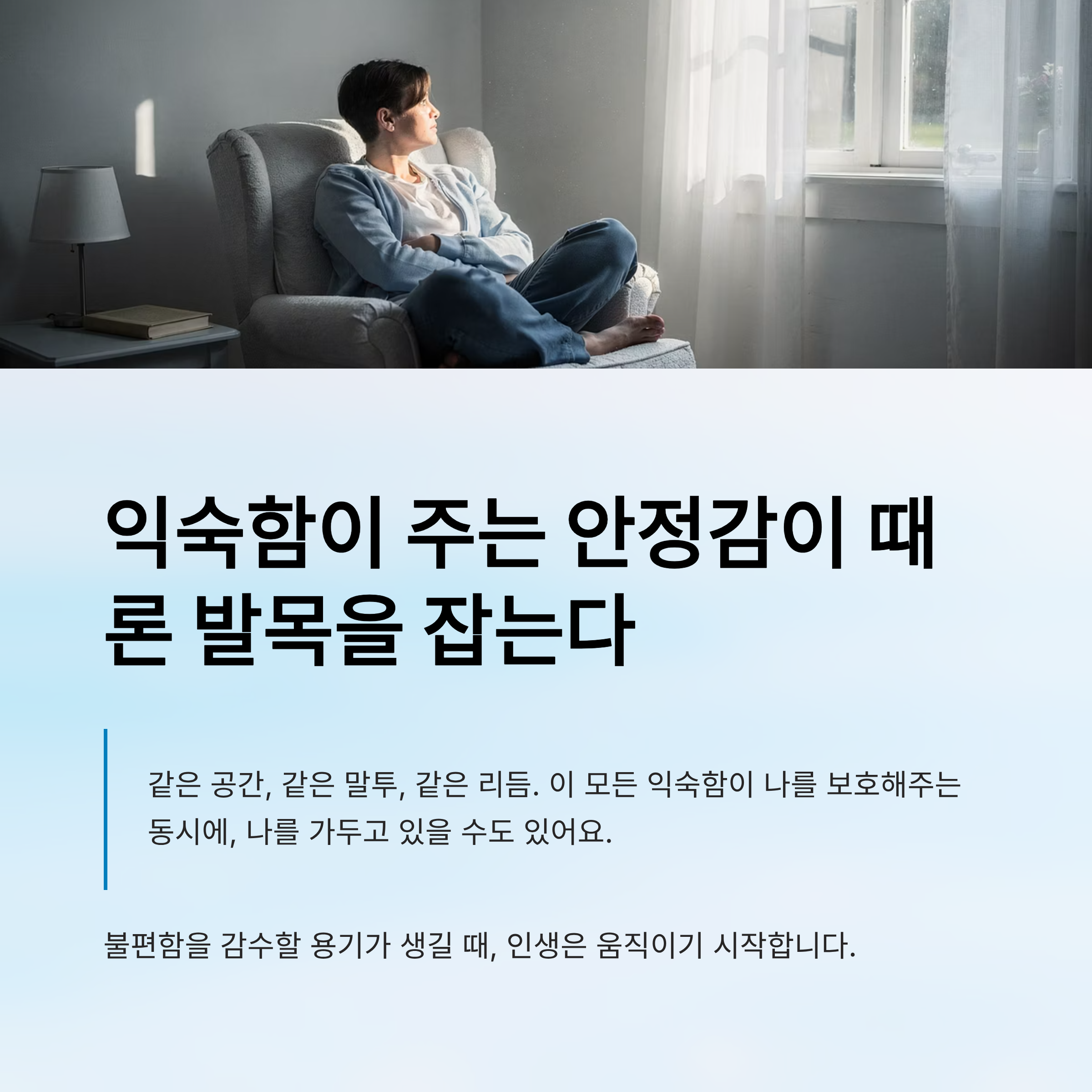 불편함을 감수할 용기가 생길 때, 인생은 움직이기 시작합니다.
