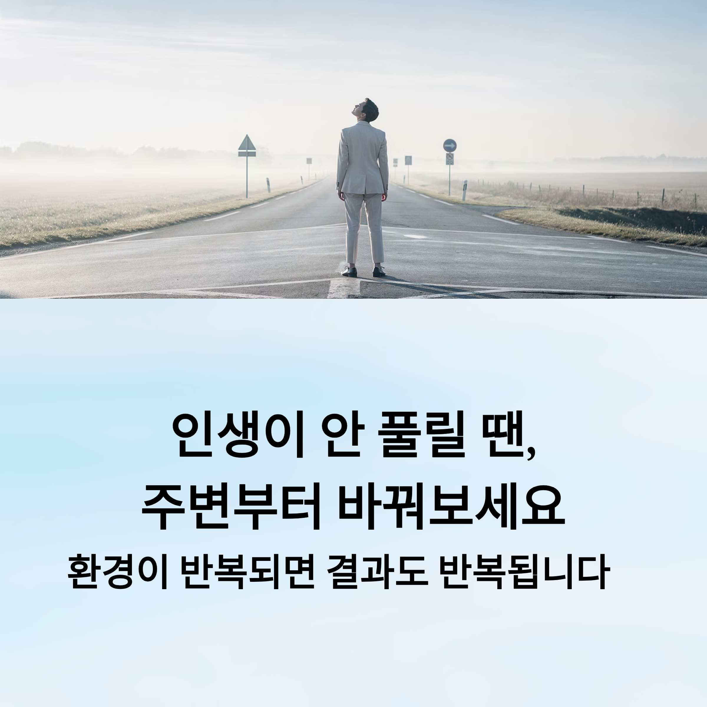 가끔은 정말 열심히 살아도 인생이 풀리지 않는 느낌이 들 때가 있습니다. 그런데 그럴 때일수록 우리를 둘러싼 '사람'과 '환경'을 돌아봐야 할 때예요. 계속 같은 문제에 부딪히고 같은 패턴 속에 머물고 있다면, 혹시 내 주변이 너무 익숙하고 변화 없는 공간에 머물러 있는 건 아닐까요? 오늘은 인생이 안 풀리는 이유가 '주변'에 있을 수 있다는 이야기를 함께 나눠보려 합니다.