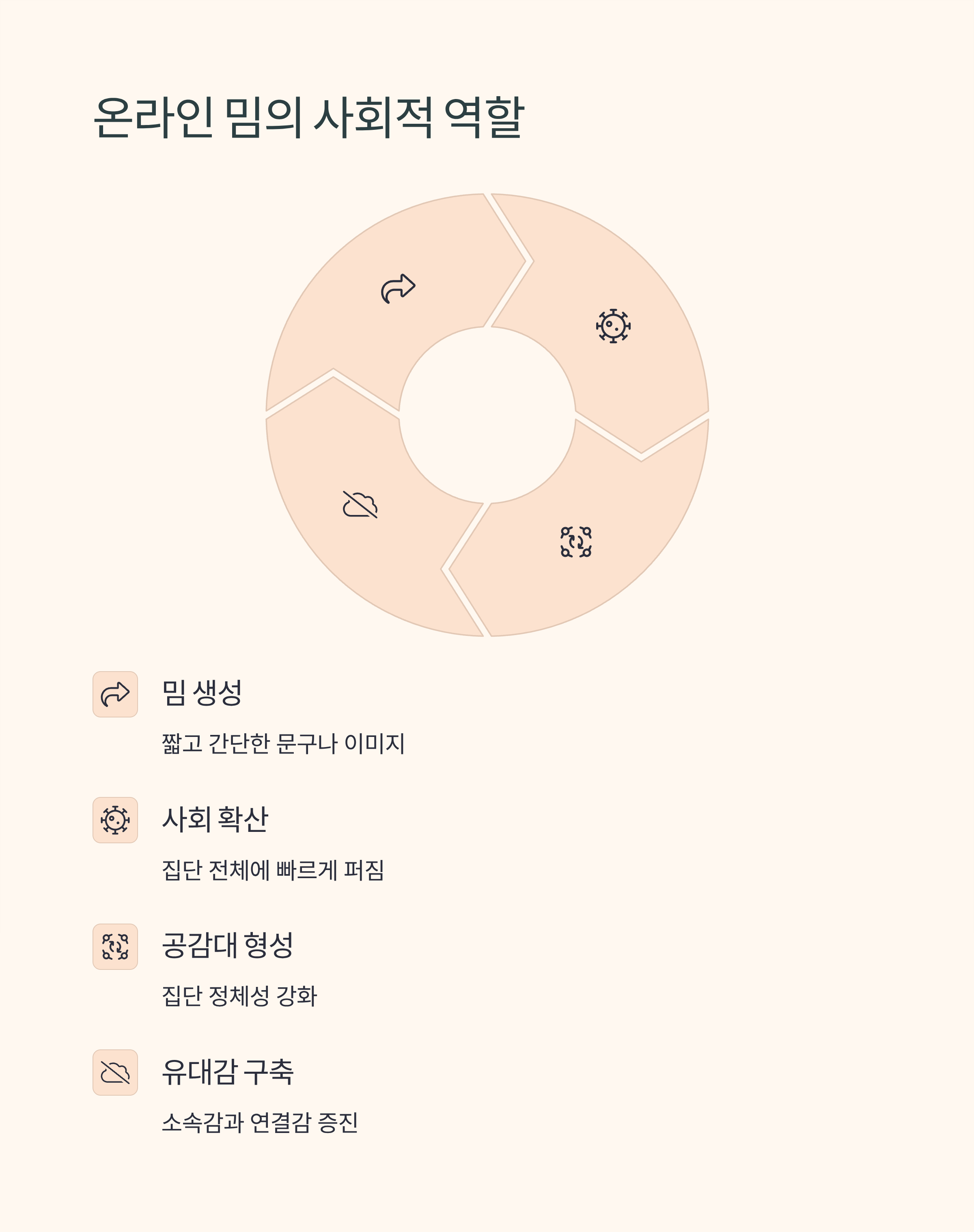 밈은 개인 간 농담을 넘어 집단적 ‘문화 장치’로 기능합니다. 짧고 간단한 문구나 이미지가 사회 전체에 퍼지며 공감대를 형성하고, 이는 곧 집단 정체성 강화로 이어집니다. 사람들은 같은 밈을 소비하며 소속감을 느끼고, 그 과정에서 더 쉽게 유대감을 쌓습니다.