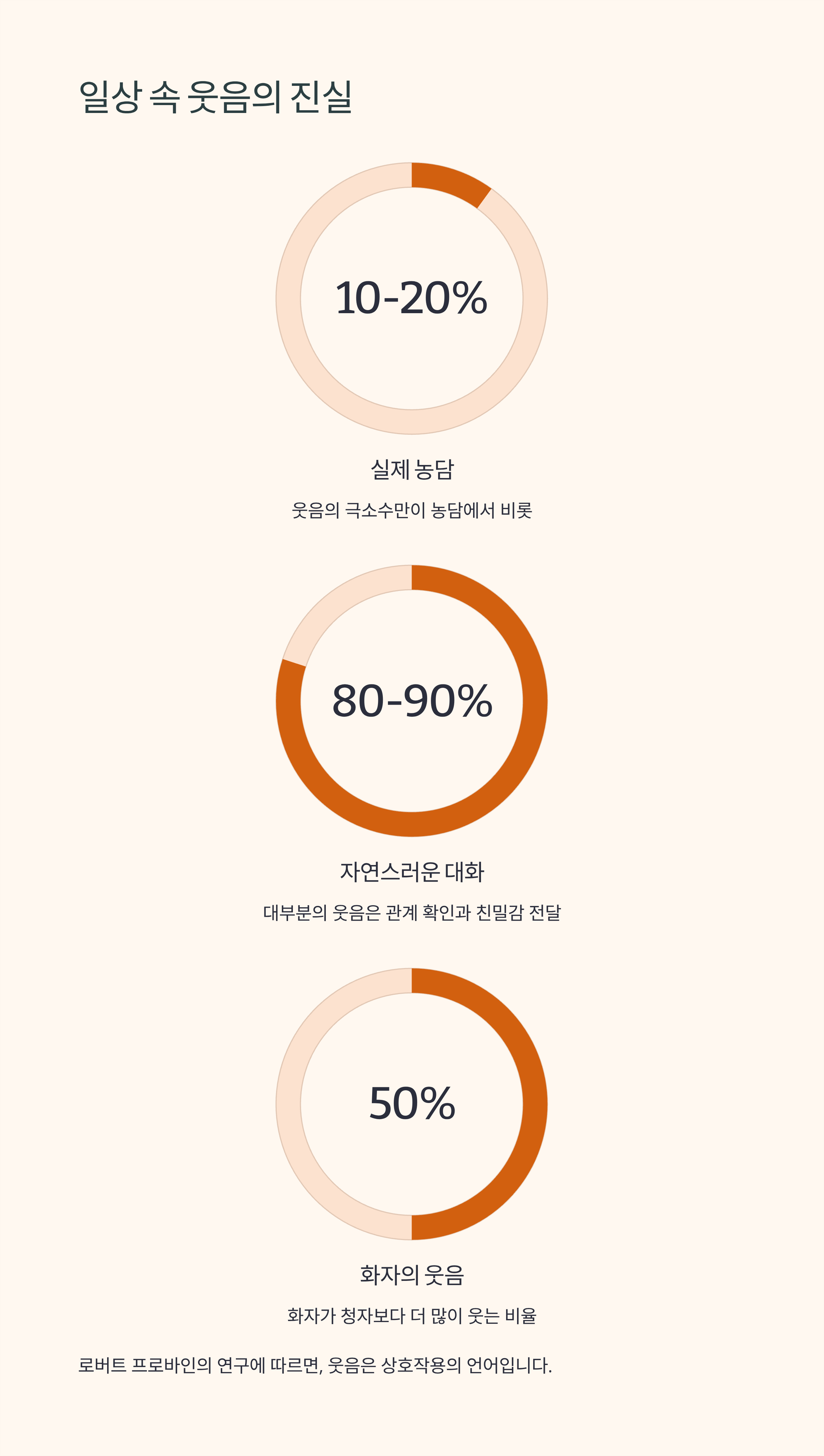 심리학자 로버트 프로바인의 연구에 따르면 웃음의 10%~20%만이 실제 농담에서 비롯되고, 나머지 대부분은 대화 중 자연스럽게 발생합니다. 이는 웃음이 단순히 재미의 결과물이 아니라 관계를 확인하고 친밀감을 전달하는 신호임을 보여줍니다. 특히 화자가 청자보다 약 50% 더 많이 웃는다는 점은 웃음이 일방향적 쾌감이 아니라 상호작용의 언어라는 점을 잘 보여줍니다.