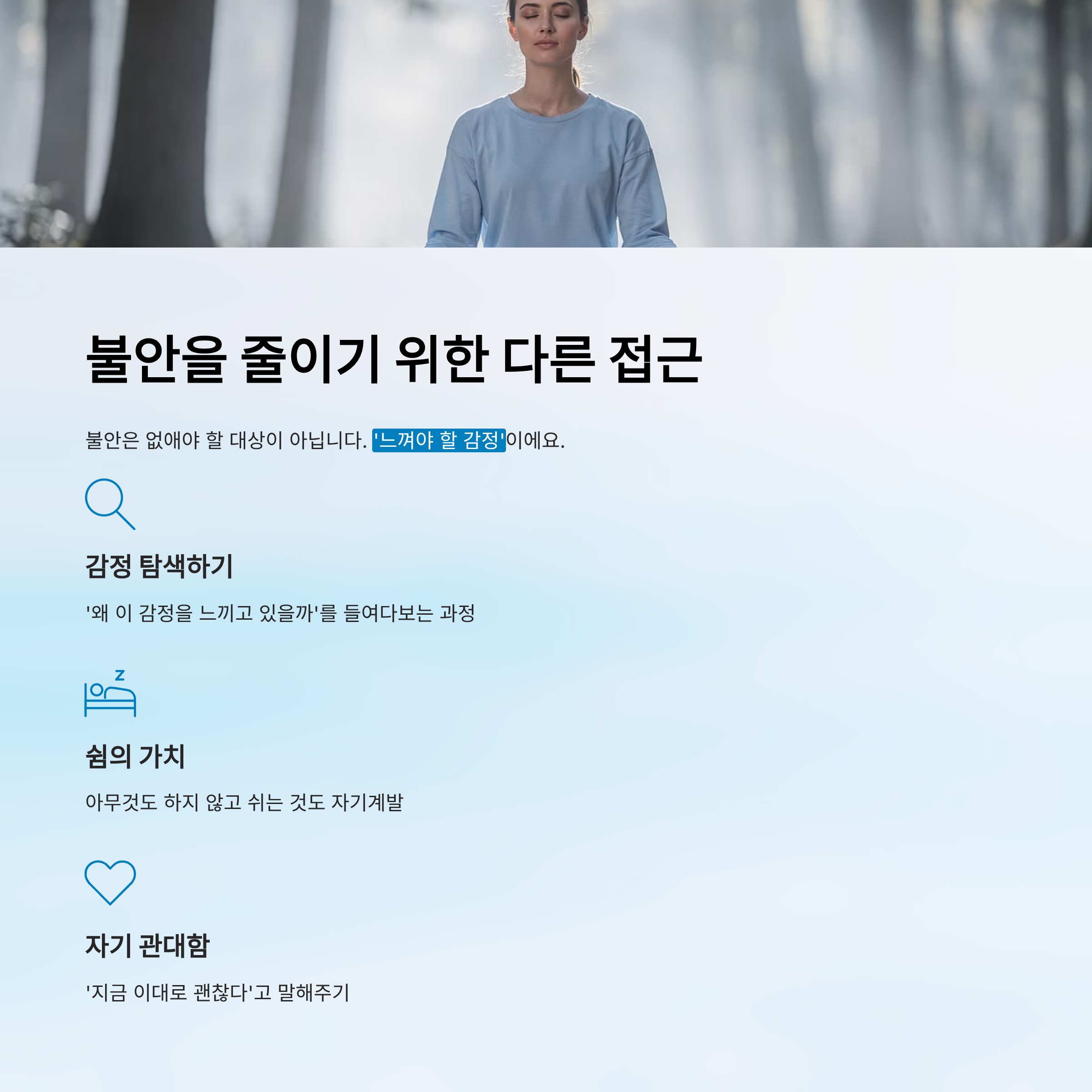 때로는 아무것도 하지 않고 쉬는 것, 스스로에게 관대해지는 것, '지금 이대로 괜찮다'고 말해주는 것이 불안을 줄이는 데 더 효과적일 수 있습니다.