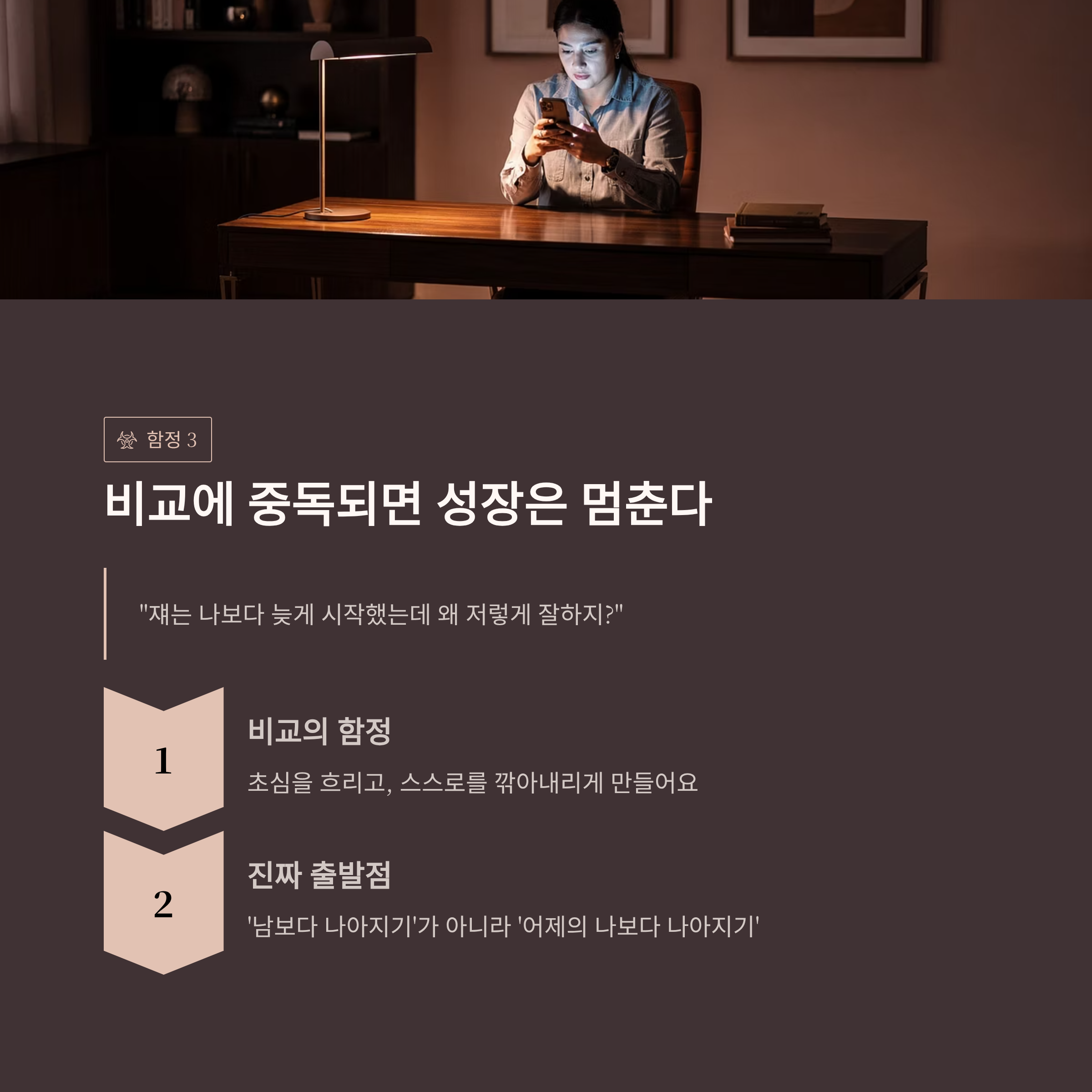 이 생각이 드는 순간, 자기계발은 '나를 위한 여정'이 아니라 '남과 경쟁하는 전쟁'이 됩니다.