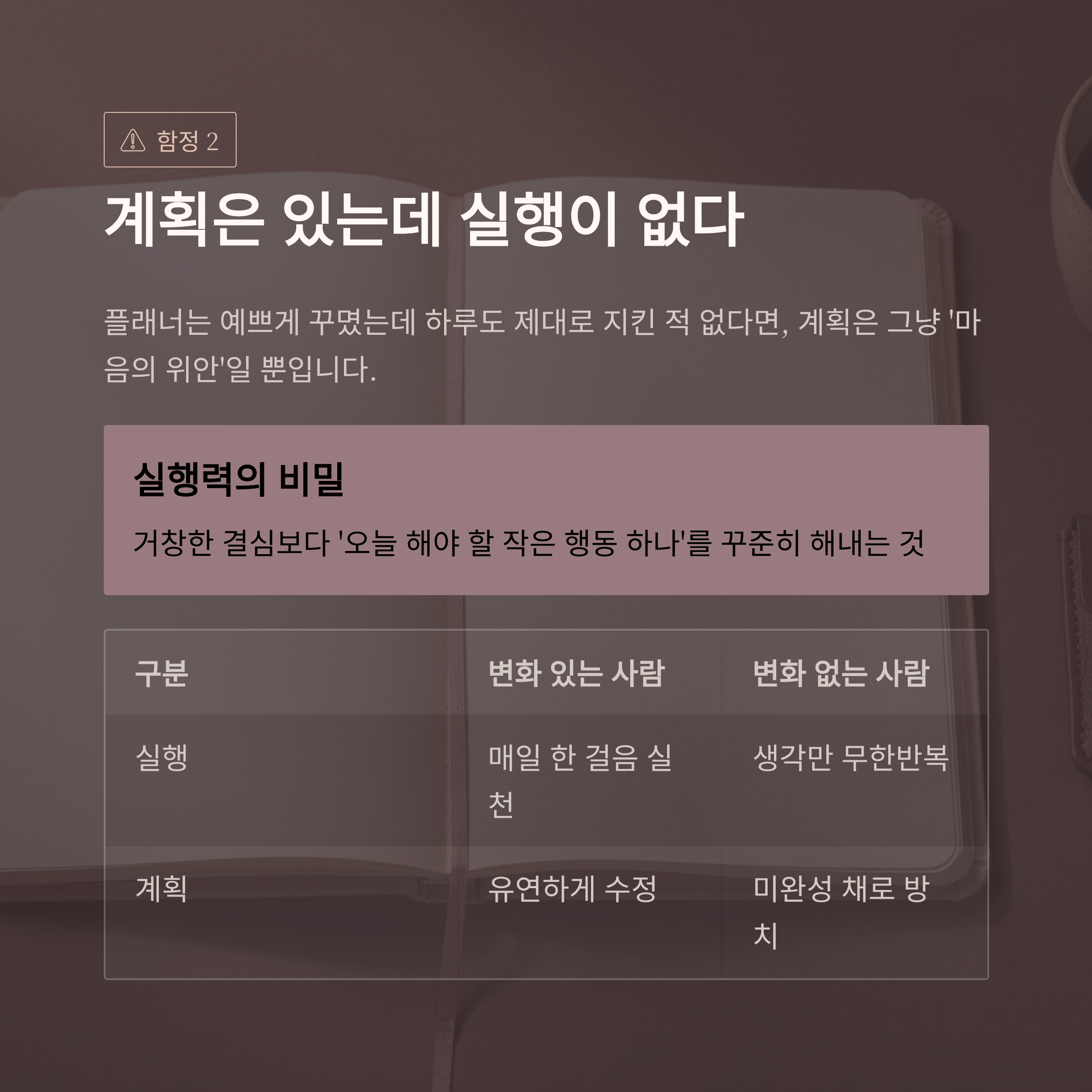 | 실행 | 매일 한 걸음 실천 | 생각만 무한반복 |